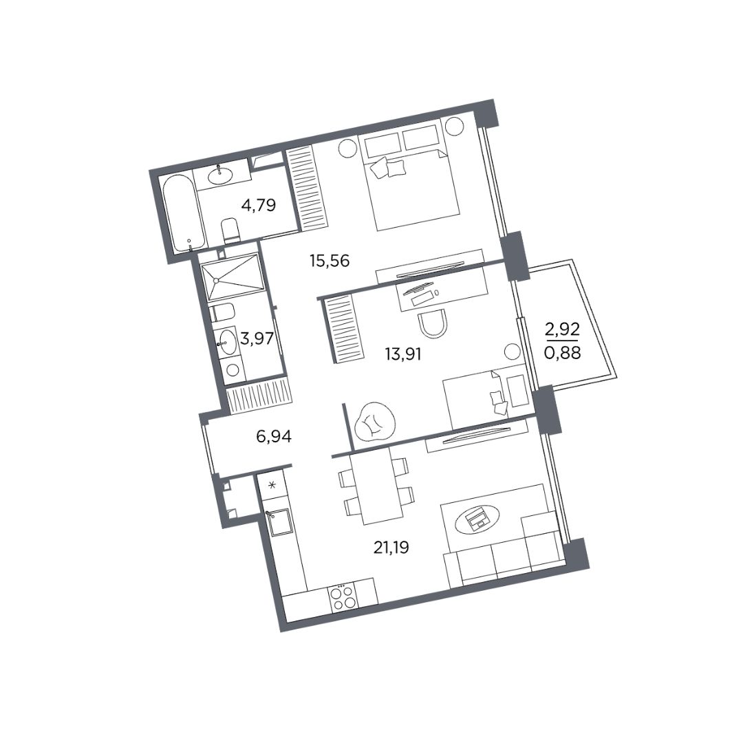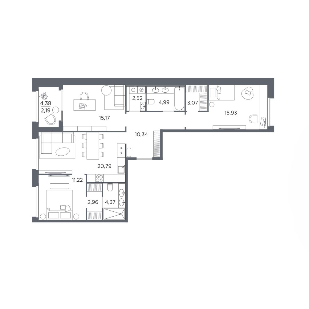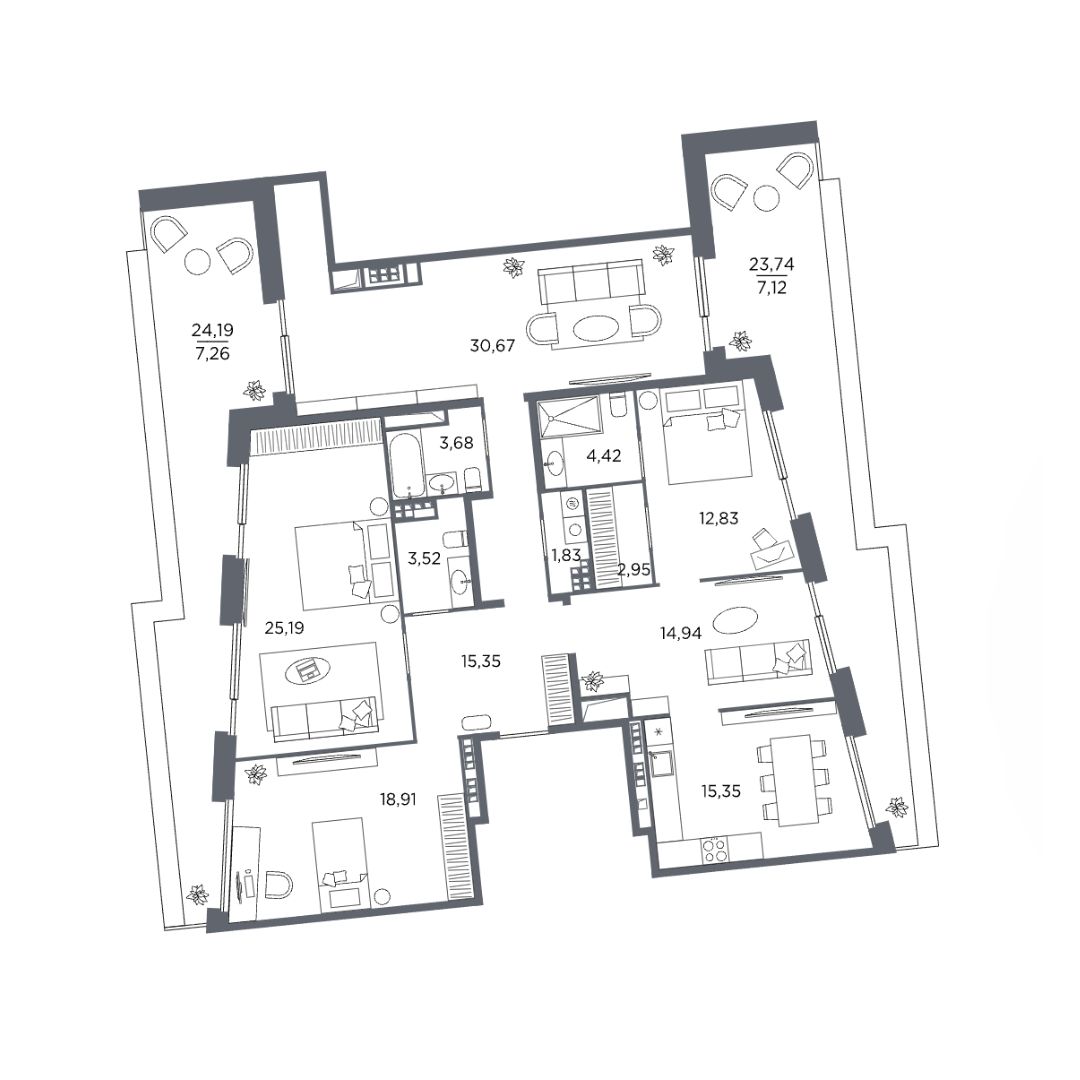 В доме — 366 квартир площадью от 44 до 180 м² с потолками от 3 до 4,65 м. Планировки включают просторные кухни-гостиные, мастер-спальни, гардеробные, кабинеты, а также эксклюзивные лоты с террасами и пентхаусы с видами на воду.