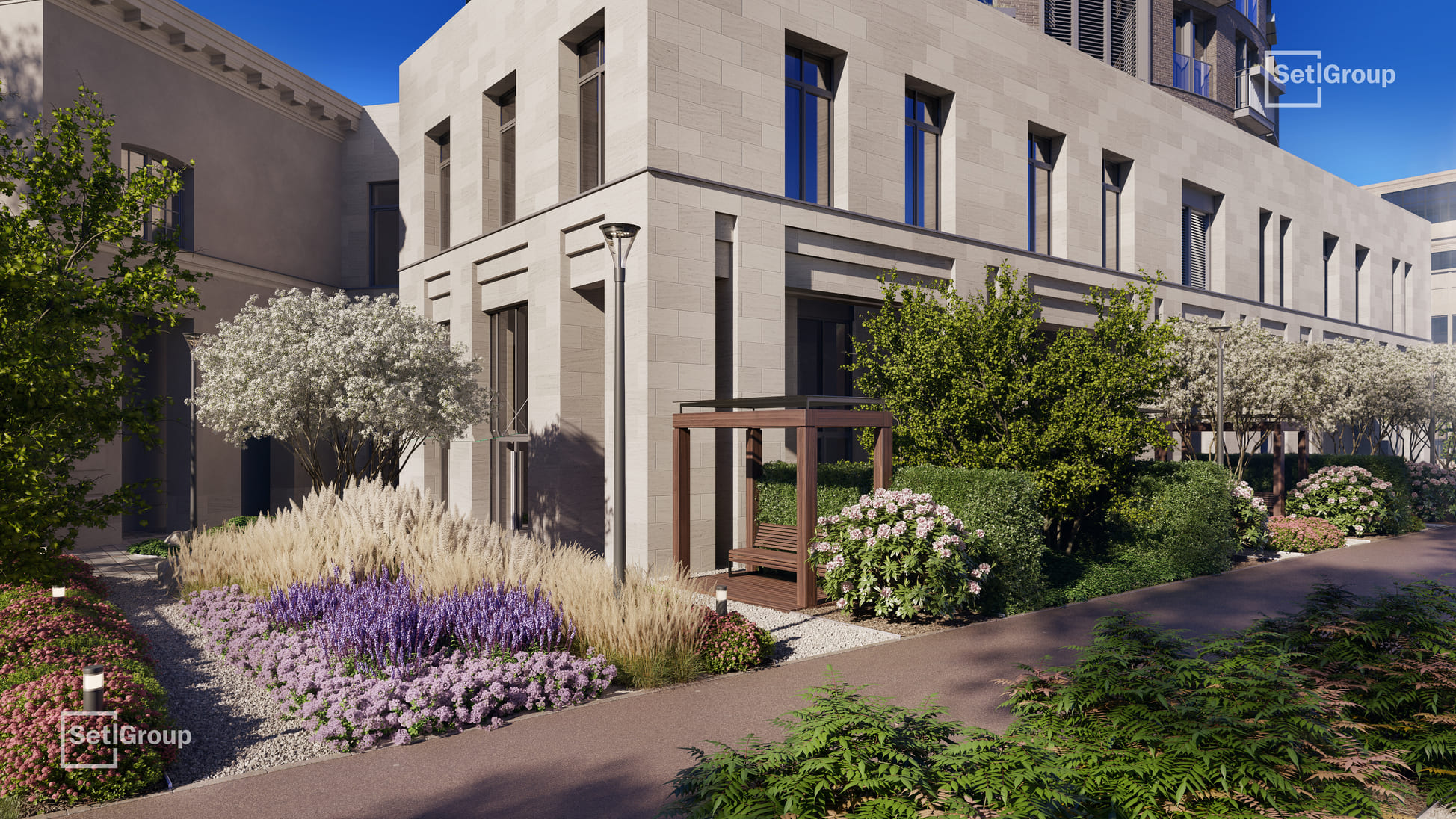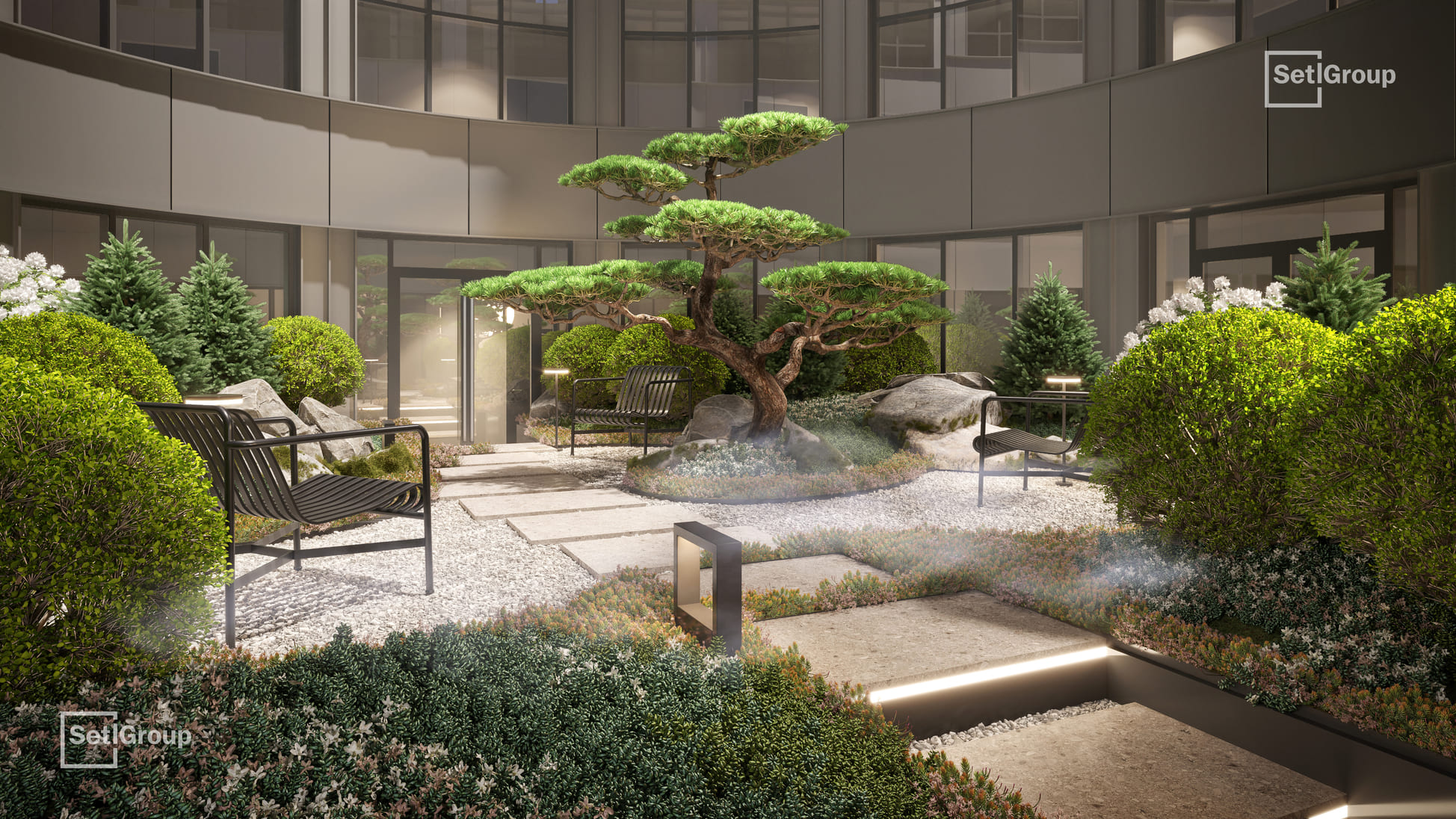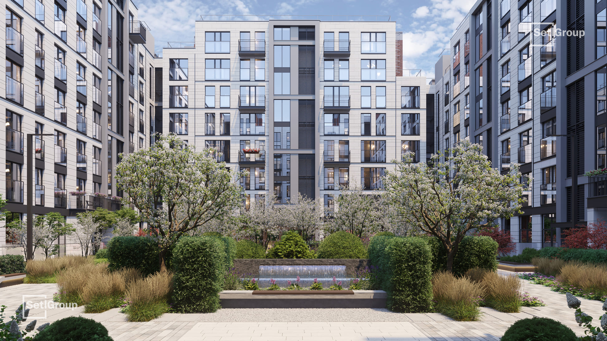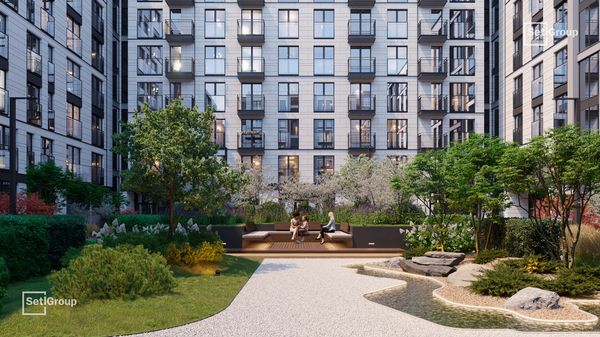 Ключевая особенность комплекса — клуб резидентов площадью 700 м²: гостиная с камином и роялем, коворкинг с переговорными и подкаст-студией, фитнес-зал с сауной и хаммамом, детский центр и приватный кинотеатр. Из клуба предусмотрен выход в камерный японский сад во внутреннем дворе.