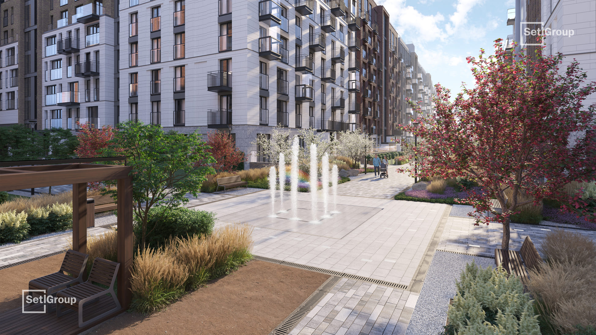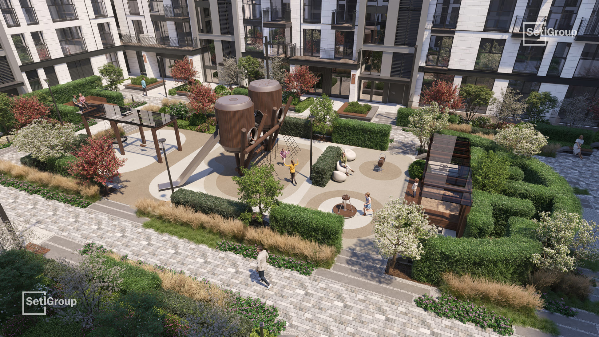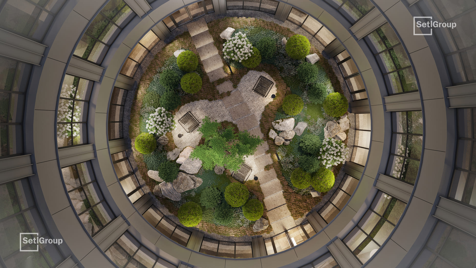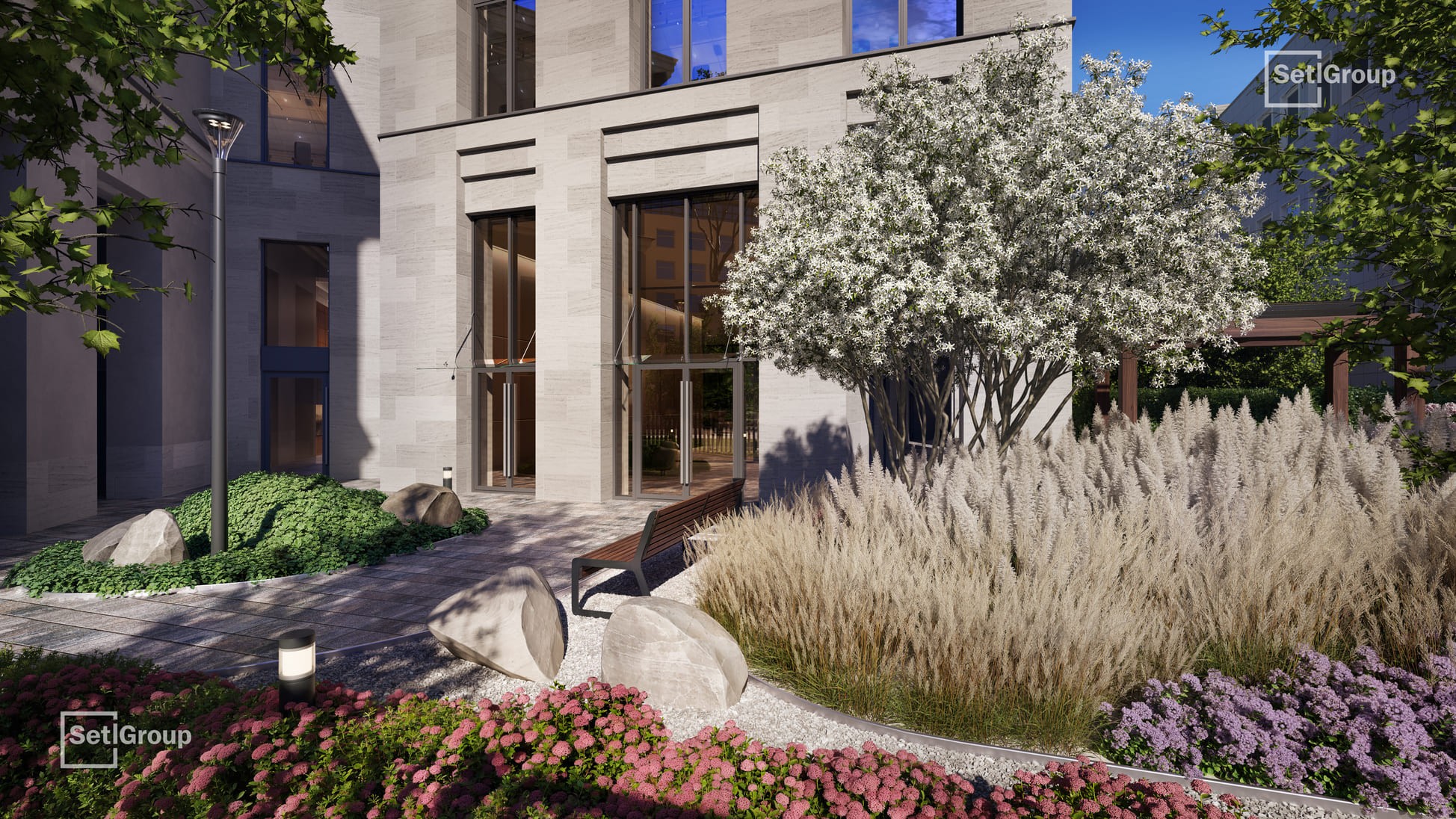 Ключевая особенность комплекса — клуб резидентов площадью 700 м²: гостиная с камином и роялем, коворкинг с переговорными и подкаст-студией, фитнес-зал с сауной и хаммамом, детский центр и приватный кинотеатр. Из клуба предусмотрен выход в камерный японский сад во внутреннем дворе.