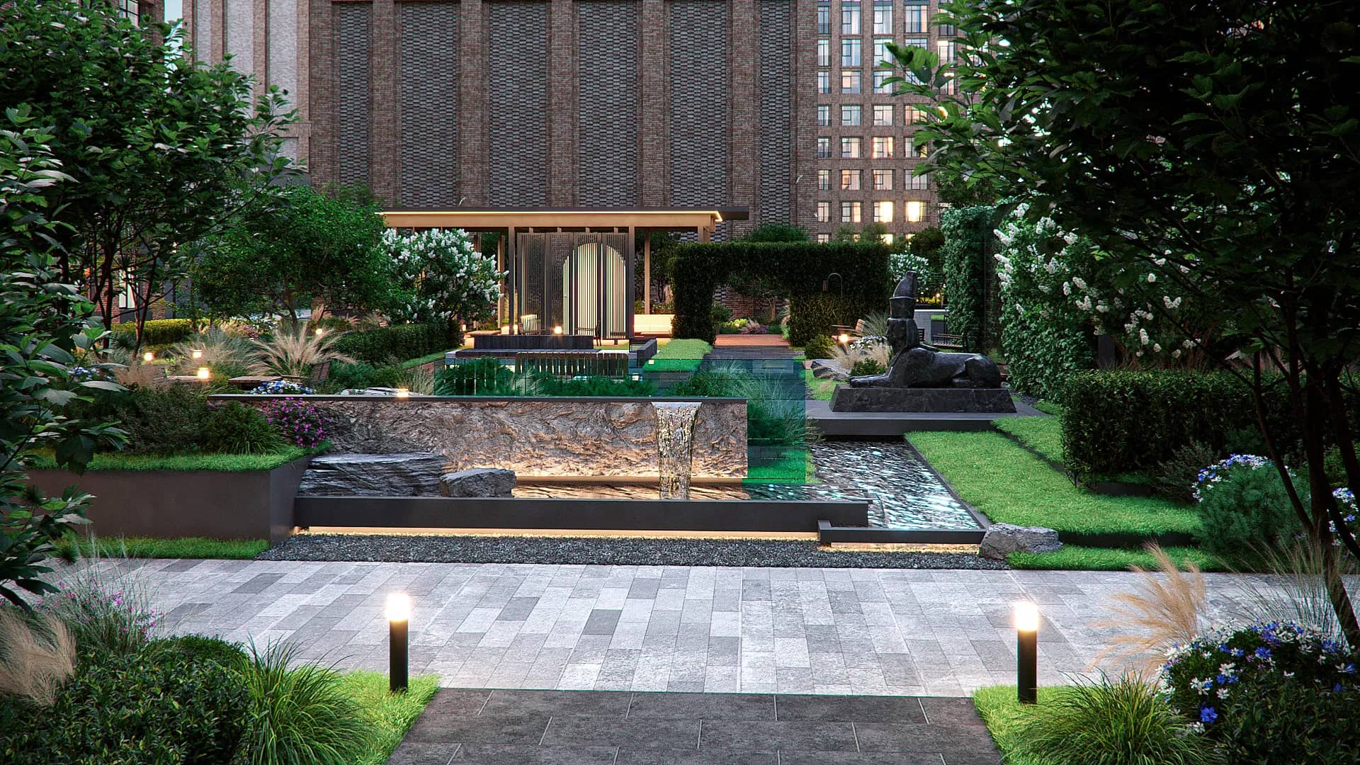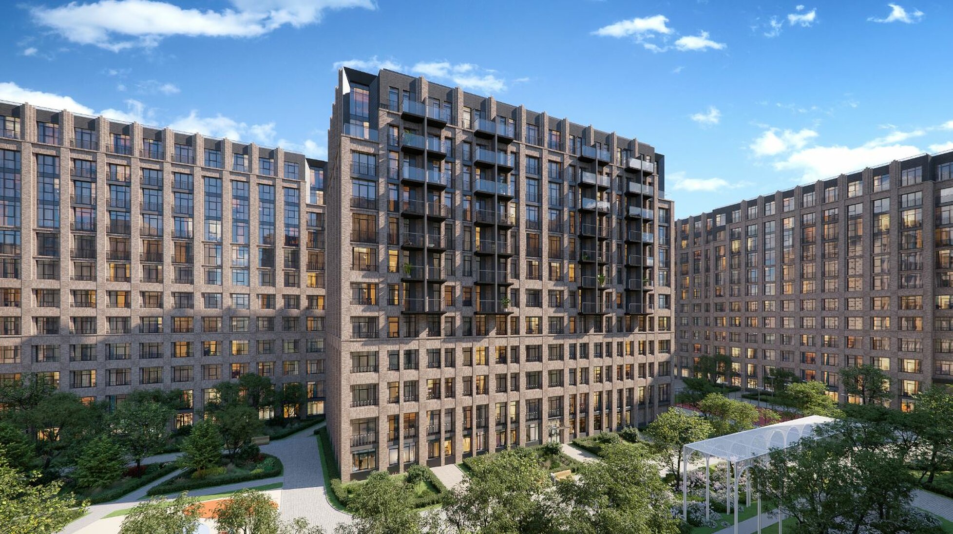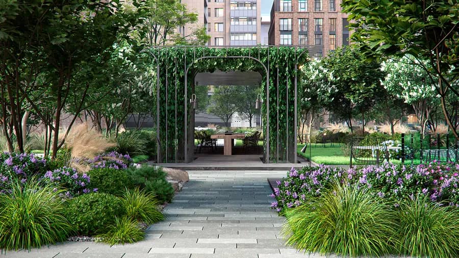 Закрытый внутренний двор утопающий в зелени с зонами отдыха и активного времяпрепровождения