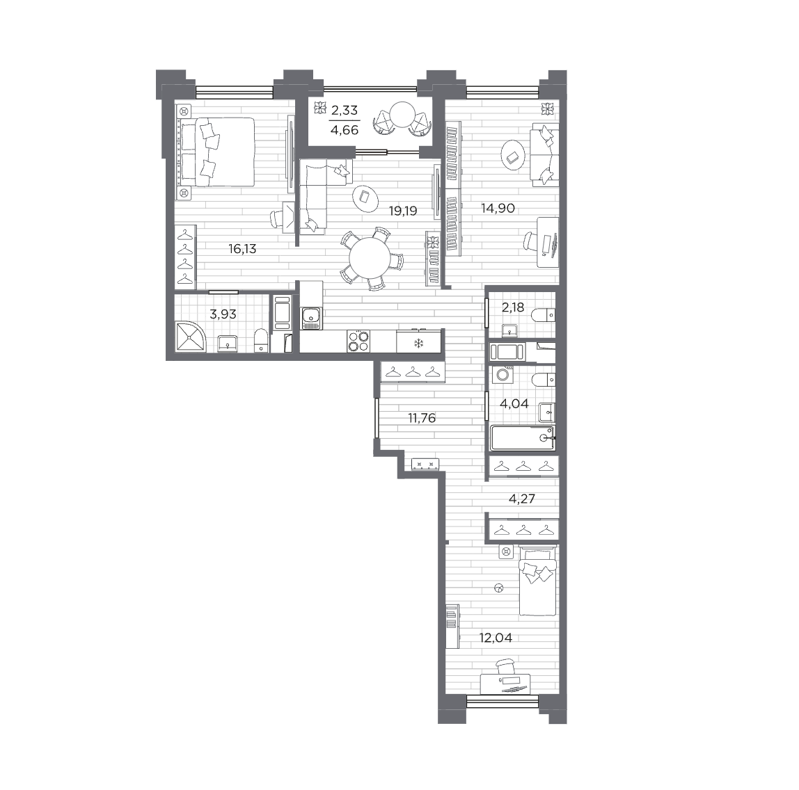 В проекте представлены квартиры от студий до просторных 3 комнатных квартир. Потолки от 3 метров.