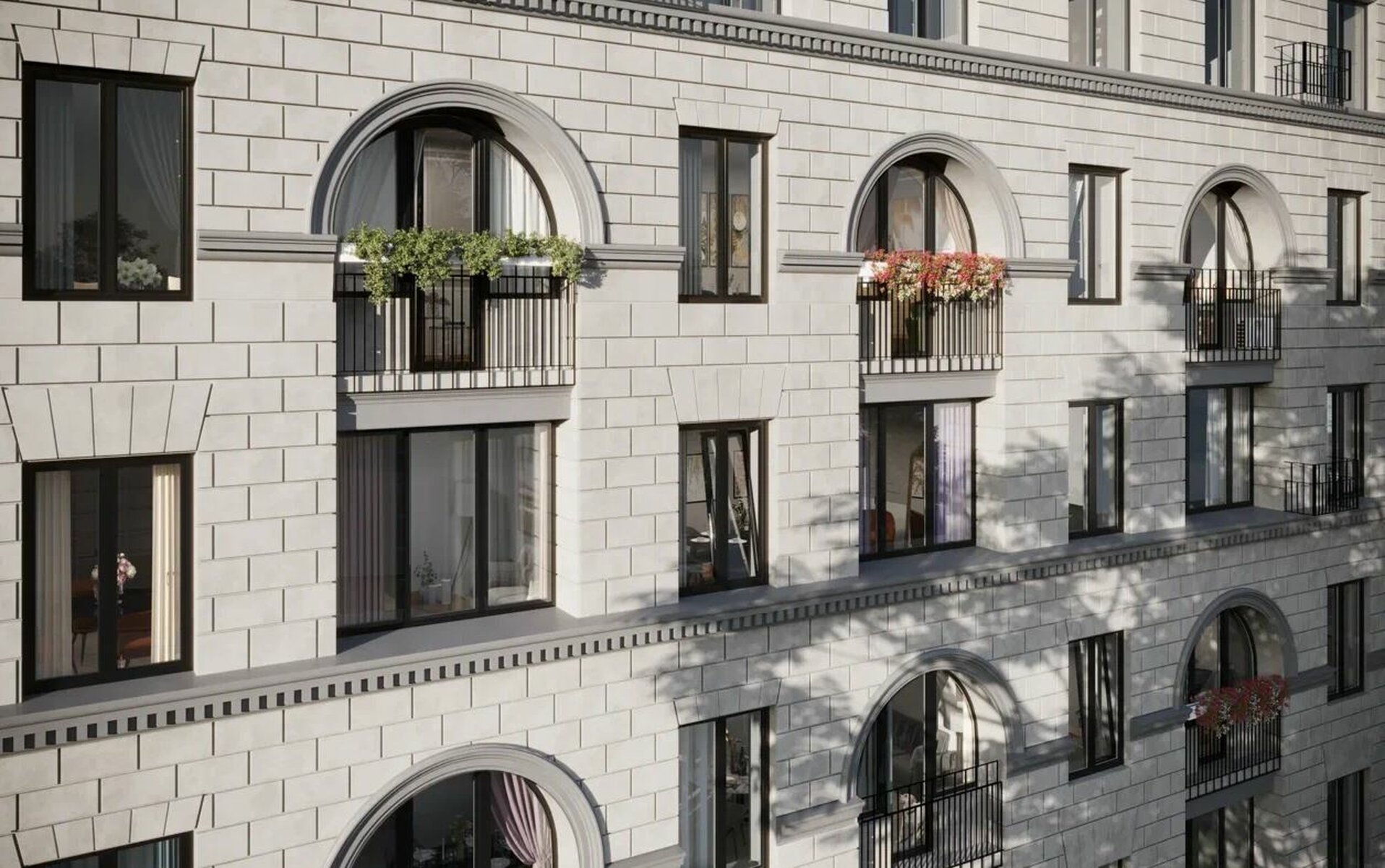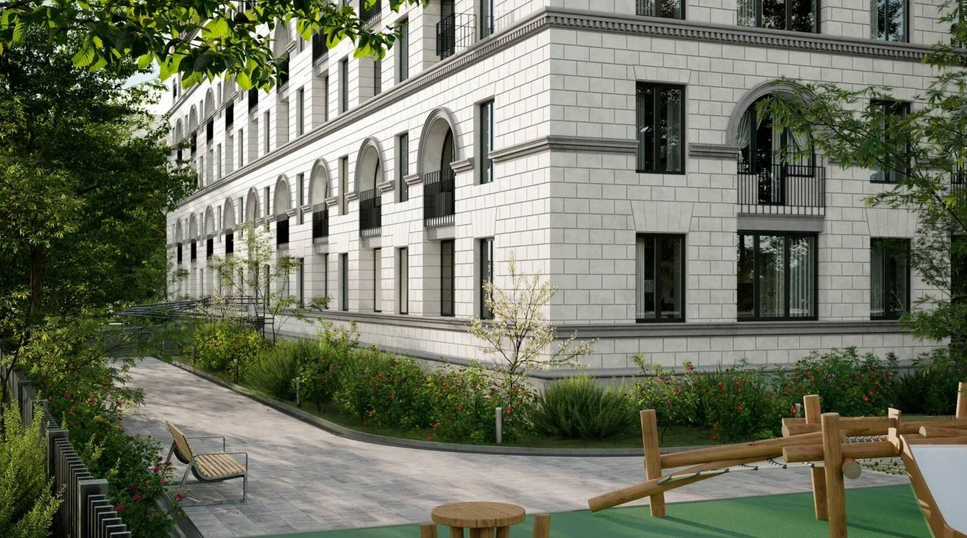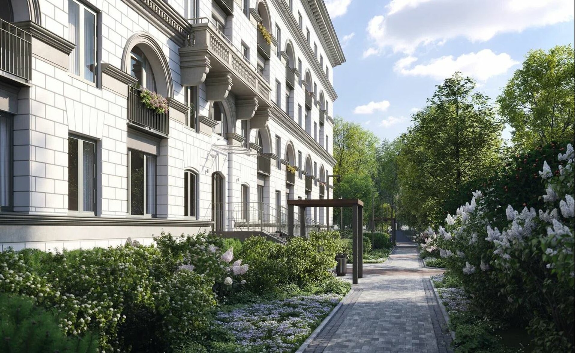 Всего 97 квартир — это редкий формат камерного проживания в окружении зелени. Толщина стен — 510 мм, что обеспечивает тишину и энергоэффективность. Планировки продуманы до деталей: мастер-спальни с ванными и гардеробными, окна в ванных комнатах и прихожих, кухни-гостиные с арочными окнами и видами на зелёный двор.
