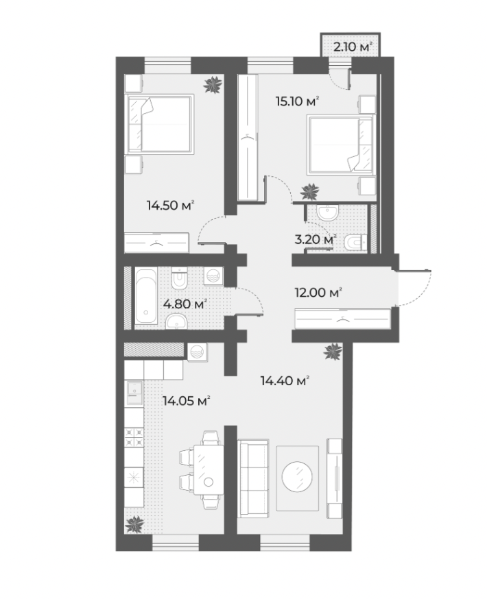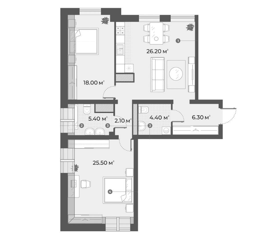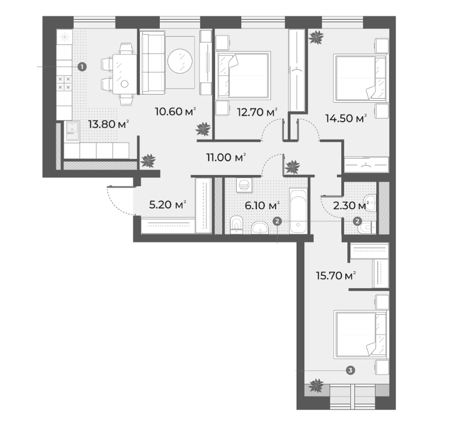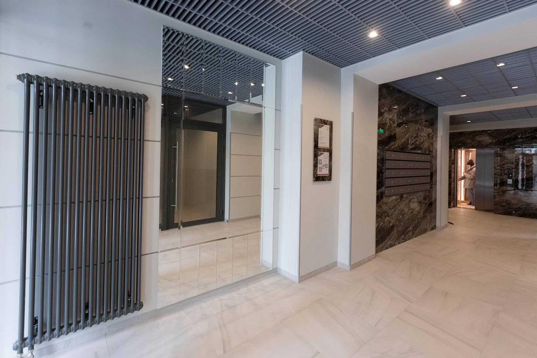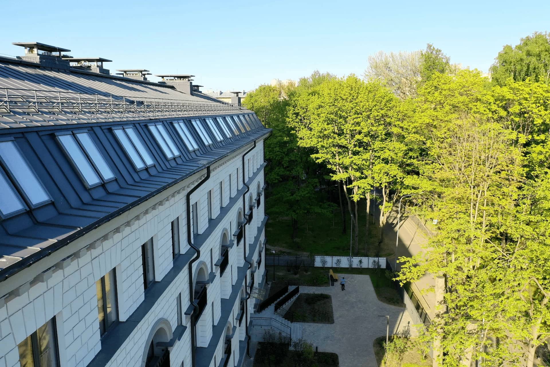 Всего 97 квартир — это редкий формат камерного проживания в окружении зелени. Толщина стен — 510 мм, что обеспечивает тишину и энергоэффективность. Планировки продуманы до деталей: мастер-спальни с ванными и гардеробными, окна в ванных комнатах и прихожих, кухни-гостиные с арочными окнами и видами на зелёный двор.