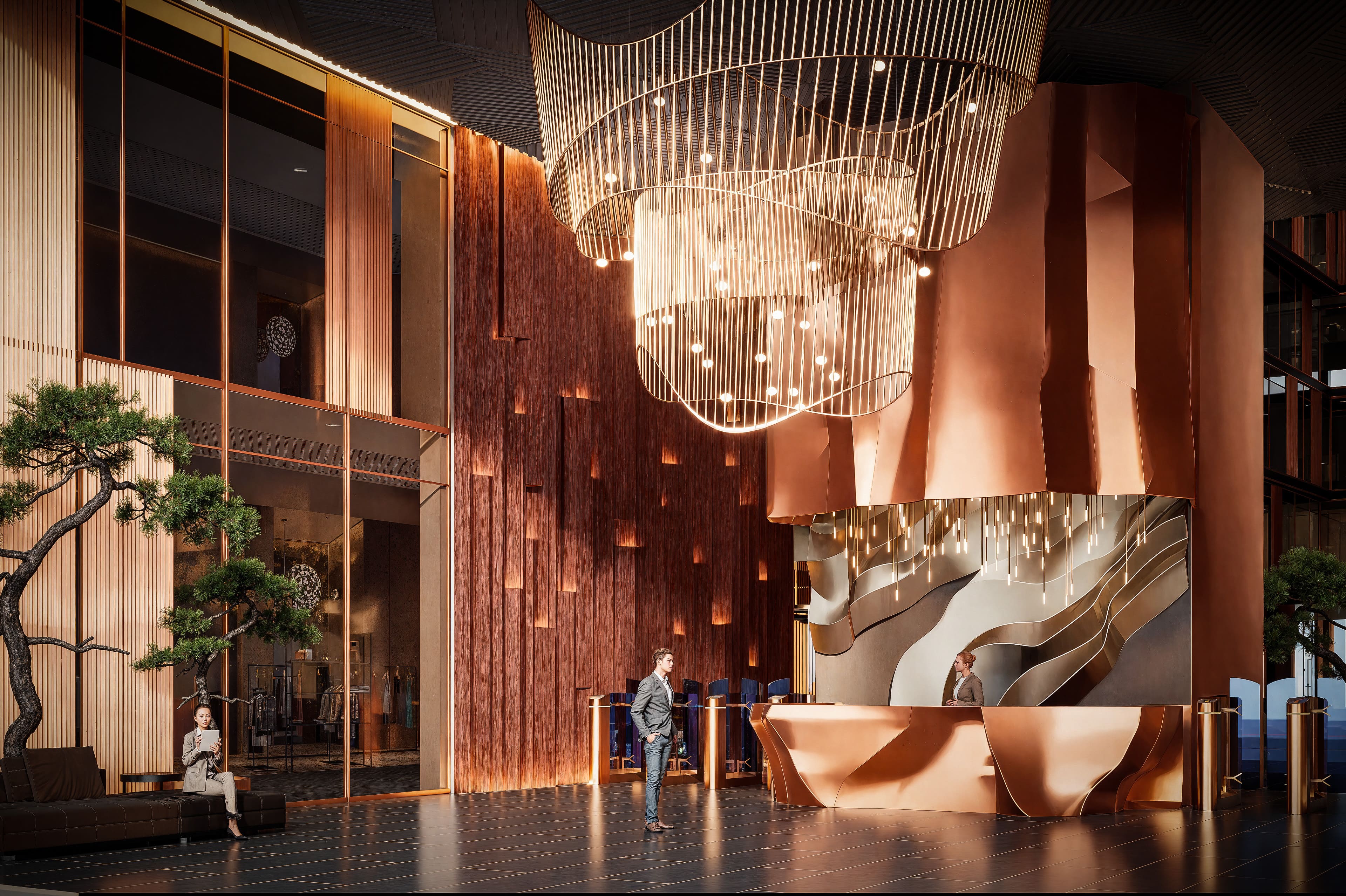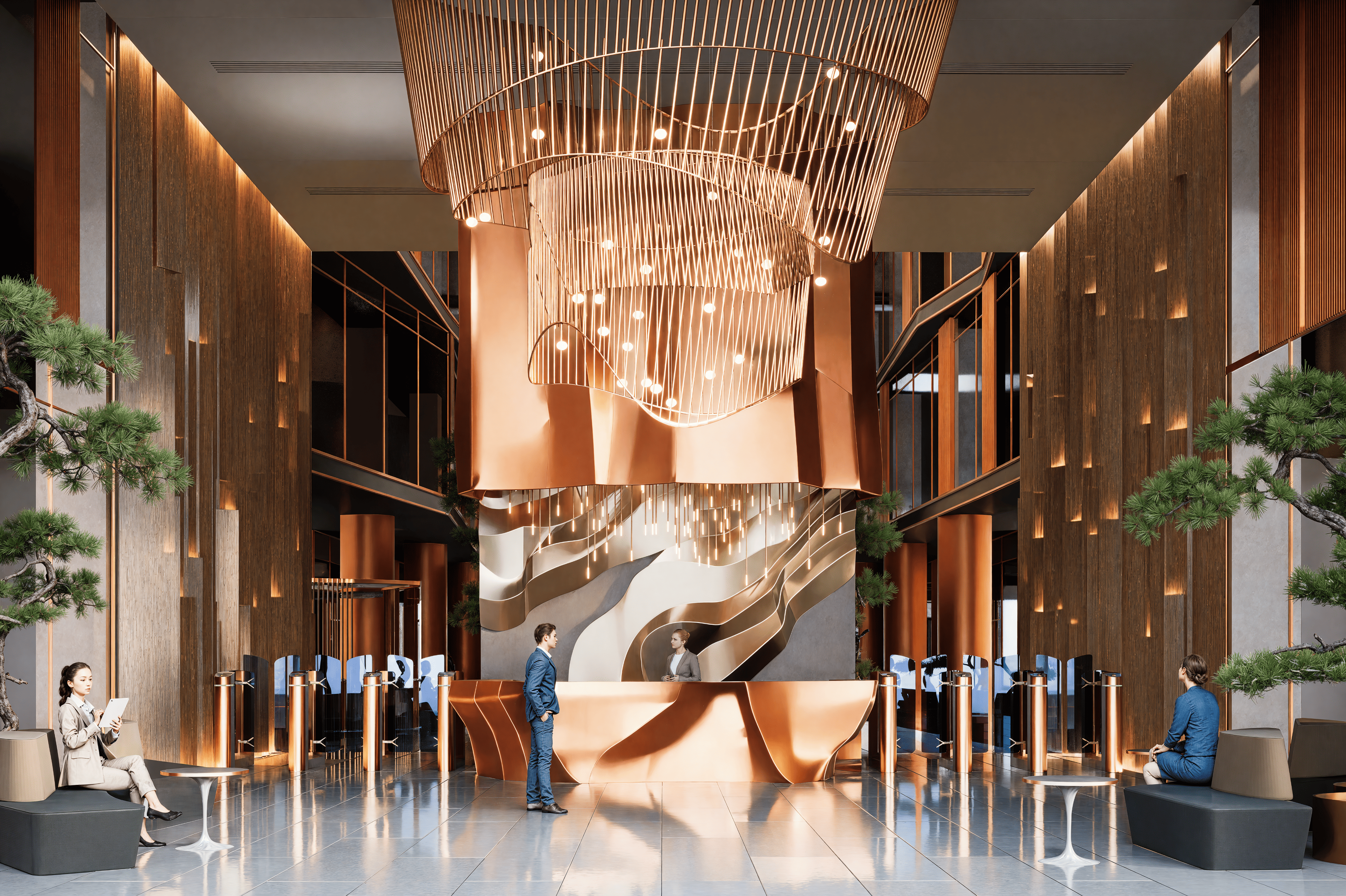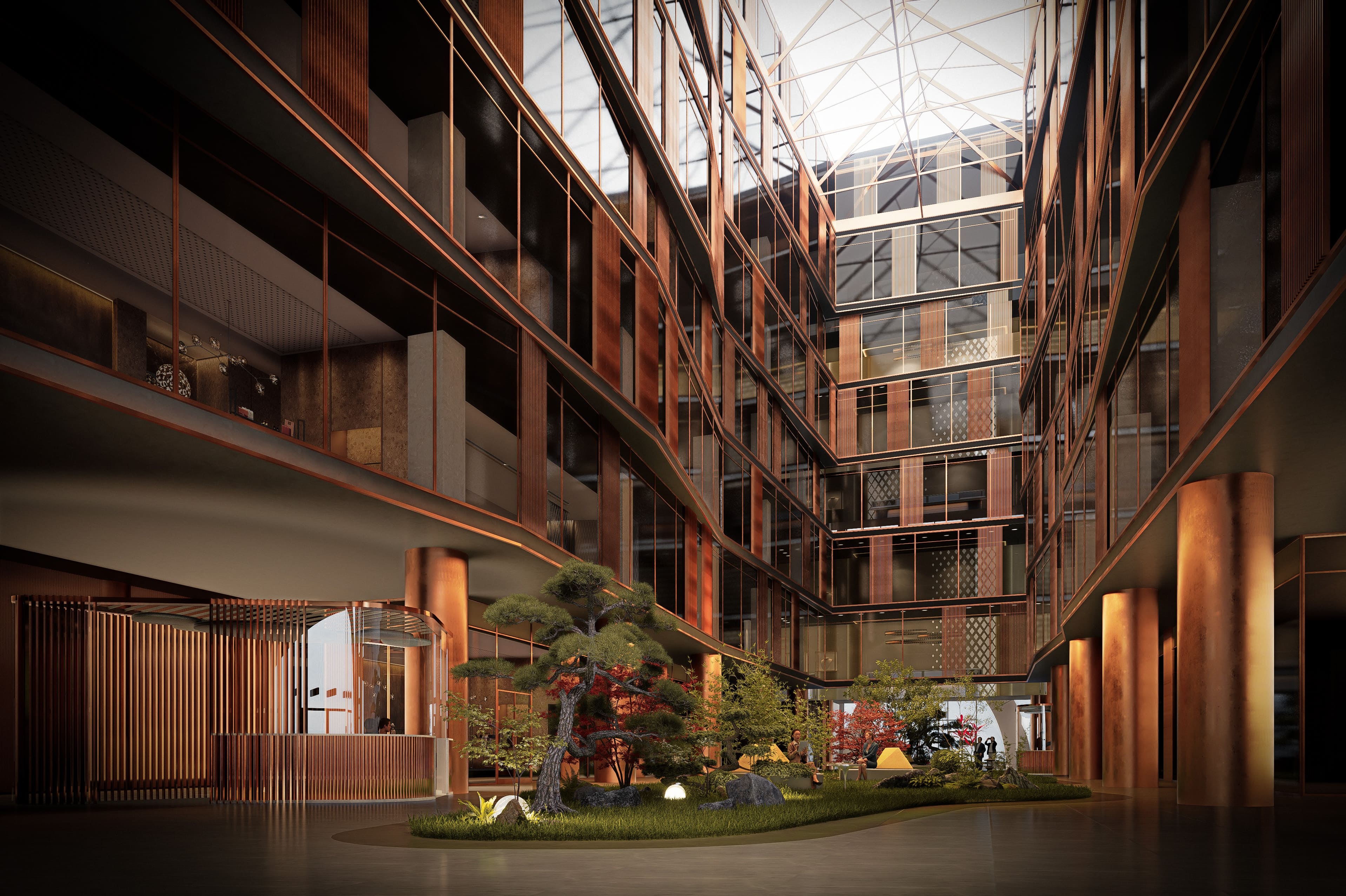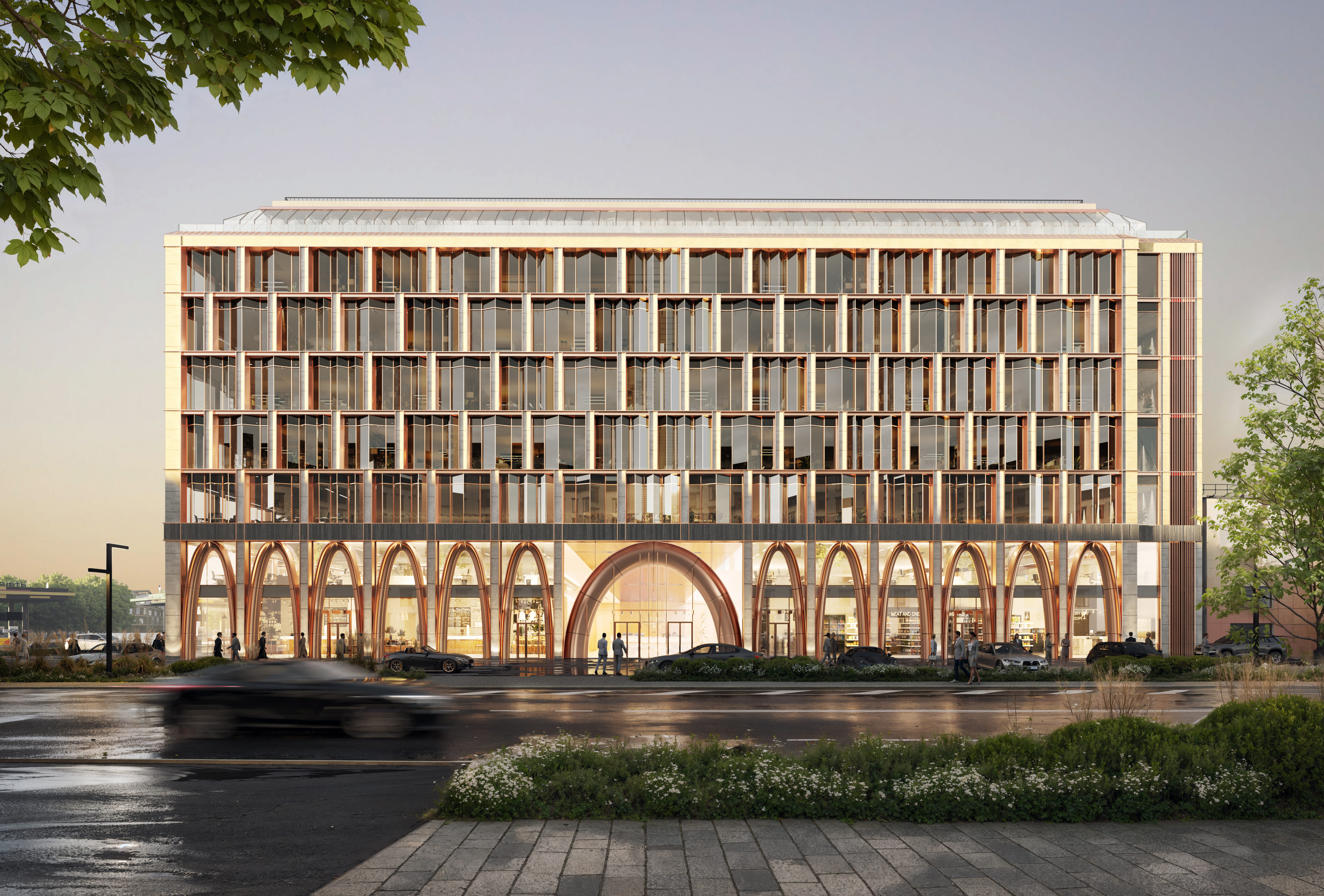 12 скоростных лифтов, двухуровневый подземный паркинг на 187 машино-мест с зарядками для электромобилей, гастрономический кластер с рестораном, винным баром и кофейнями, а также терраса на восьмом этаже для работы и неформальных встреч.