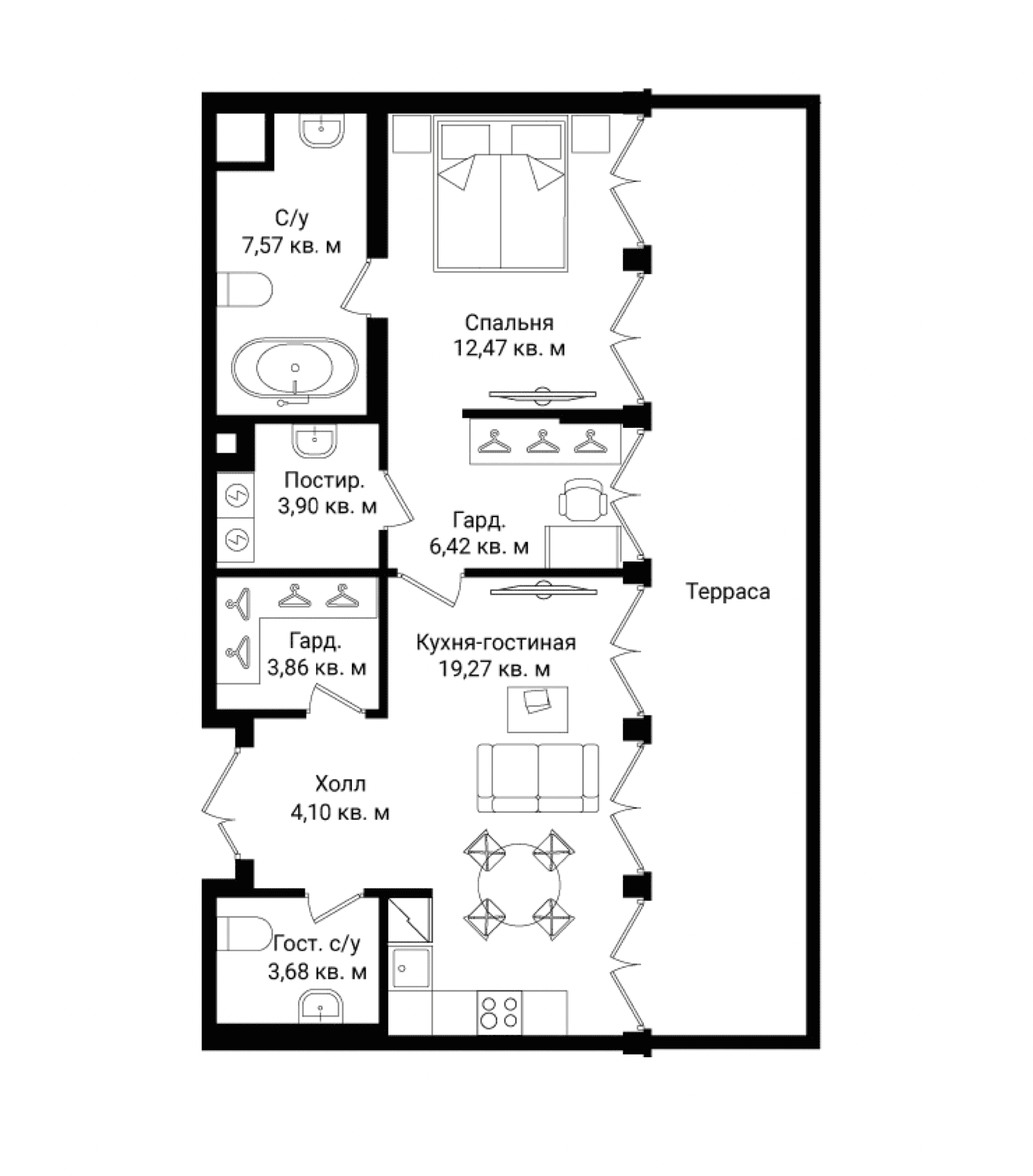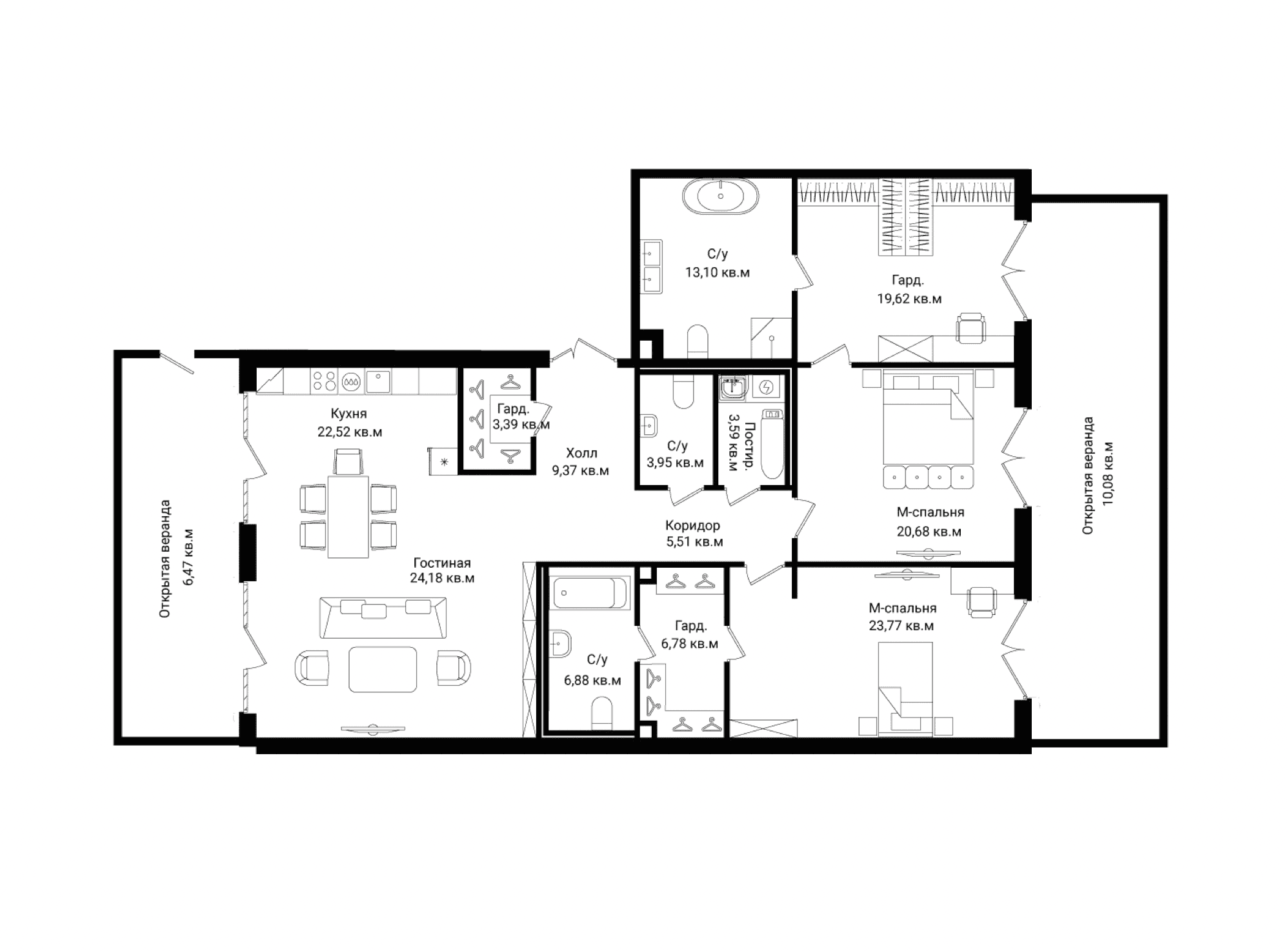 В резиденциях — высокие потолки до 3,4 м, панорамные окна, продуманные планировки, террасы и видовые квартиры на верхних этажах. Инженерия соответствует стандартам домов делюкс-класса: индивидуальная система вентиляции и кондиционирования, тёплые полы, глубокая шумоизоляция, фильтрация воды и умные системы безопасности.