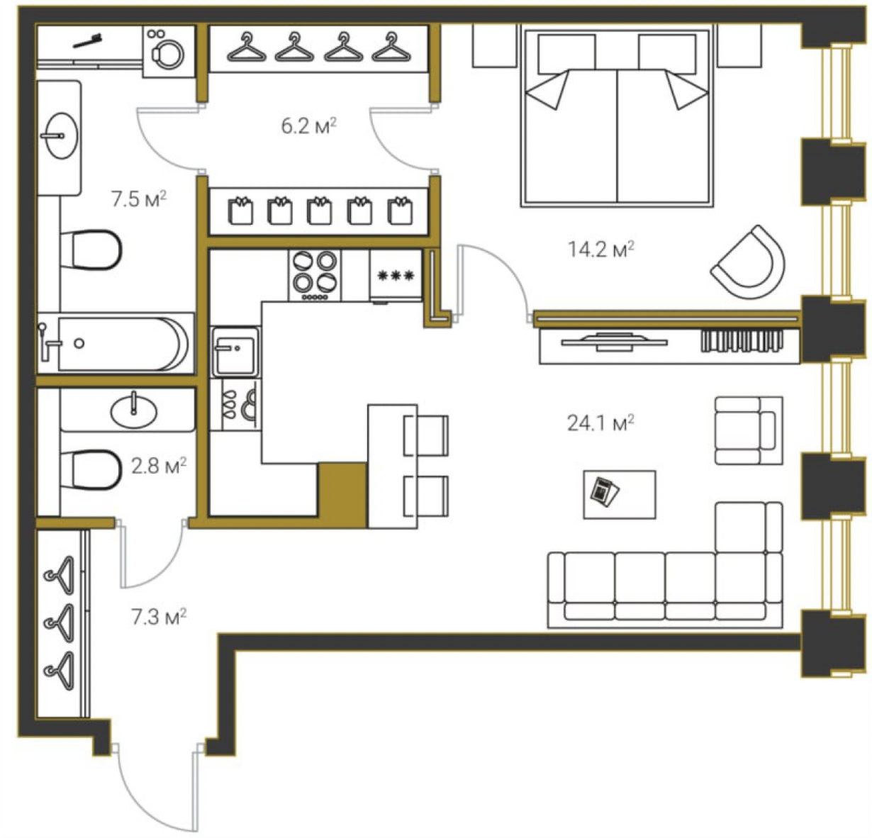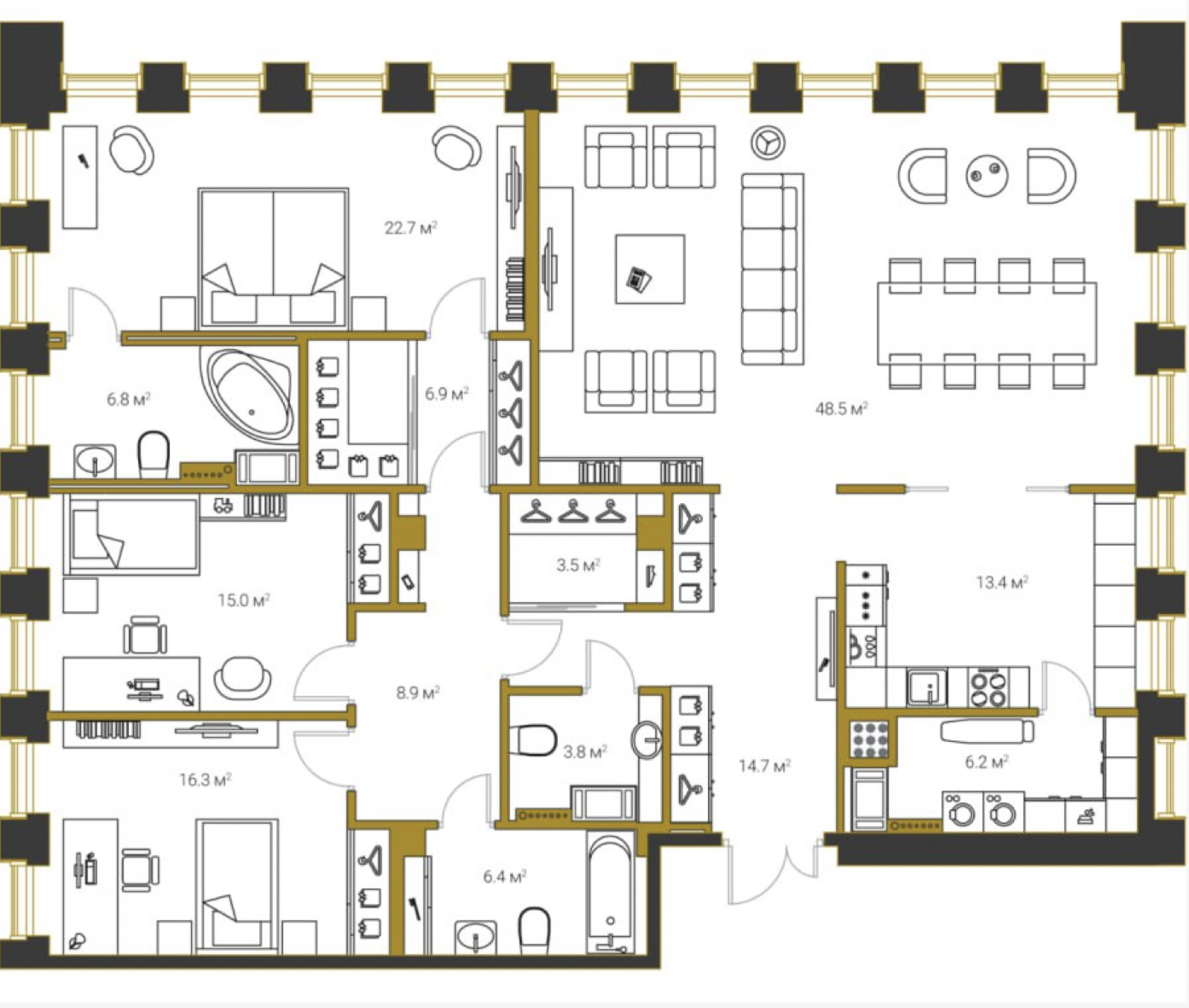 Панорамные окна, потолки до 3,2 м, системы вентиляции и очистки воздуха, интеллектуальное управление климатом и освещением. Территория дома закрыта и благоустроена: двухуровневый подземный паркинг, двор без машин, видеонаблюдение и Face ID-доступ, а в лобби — дизайнерская отделка и консьерж-сервис.