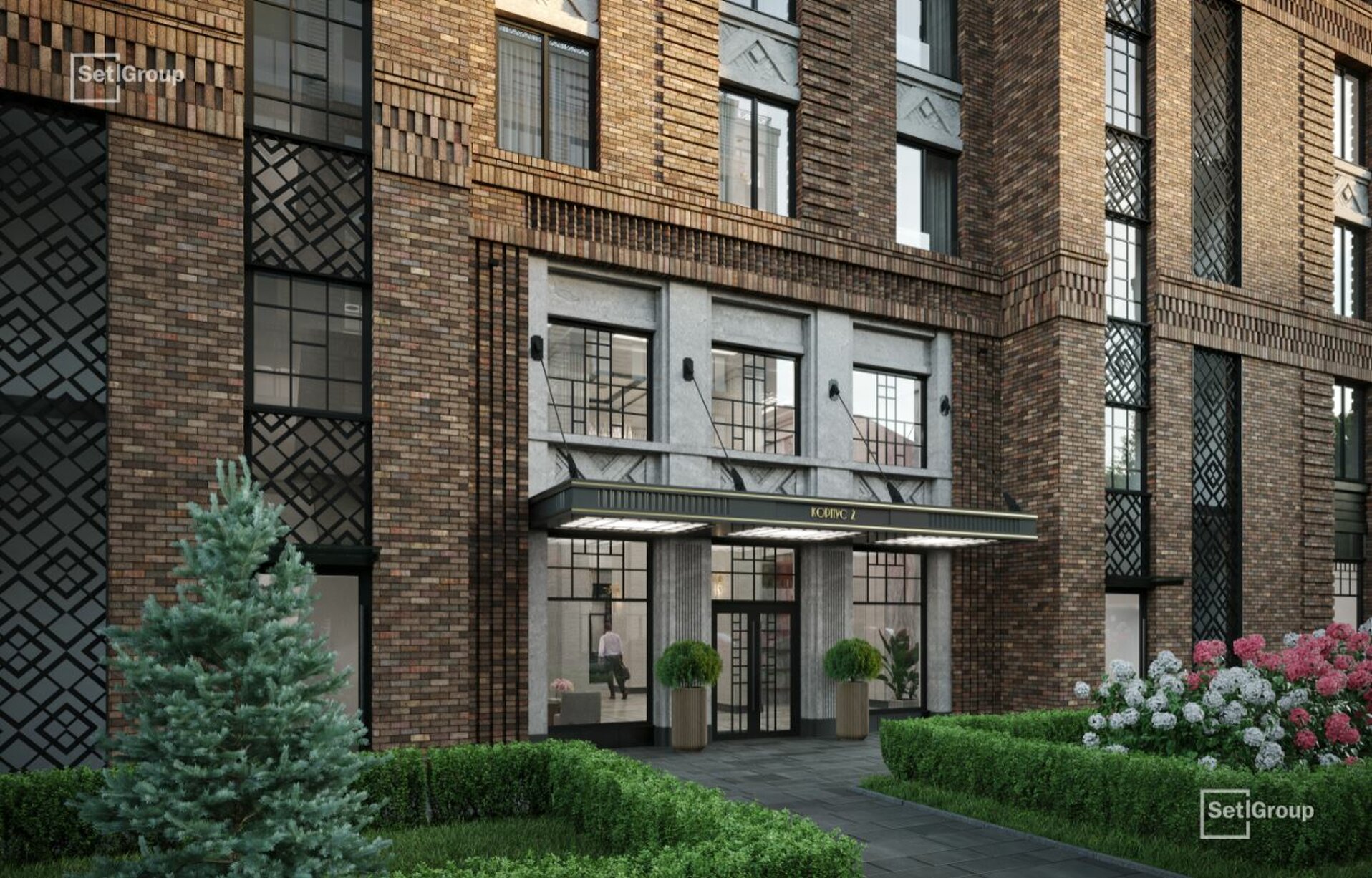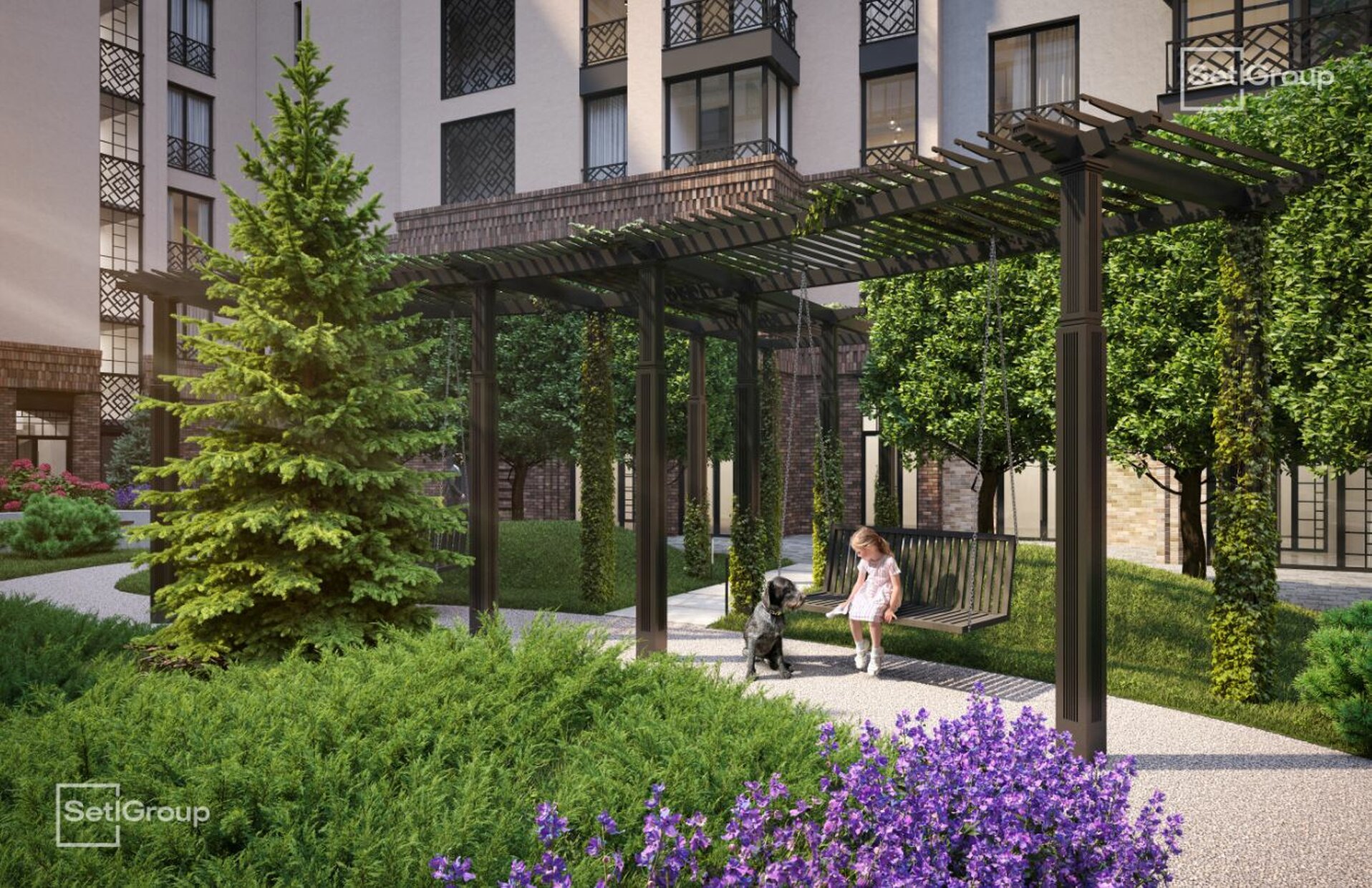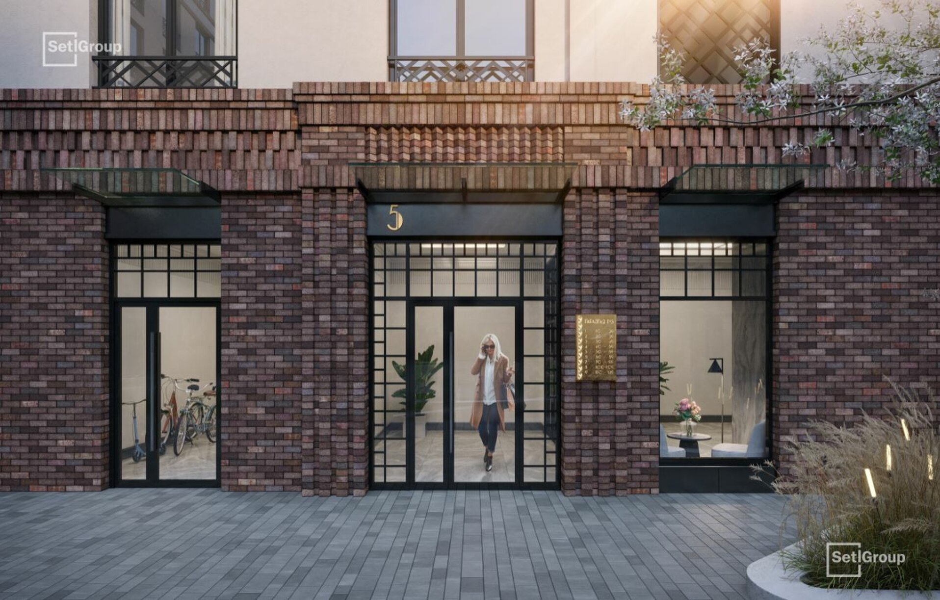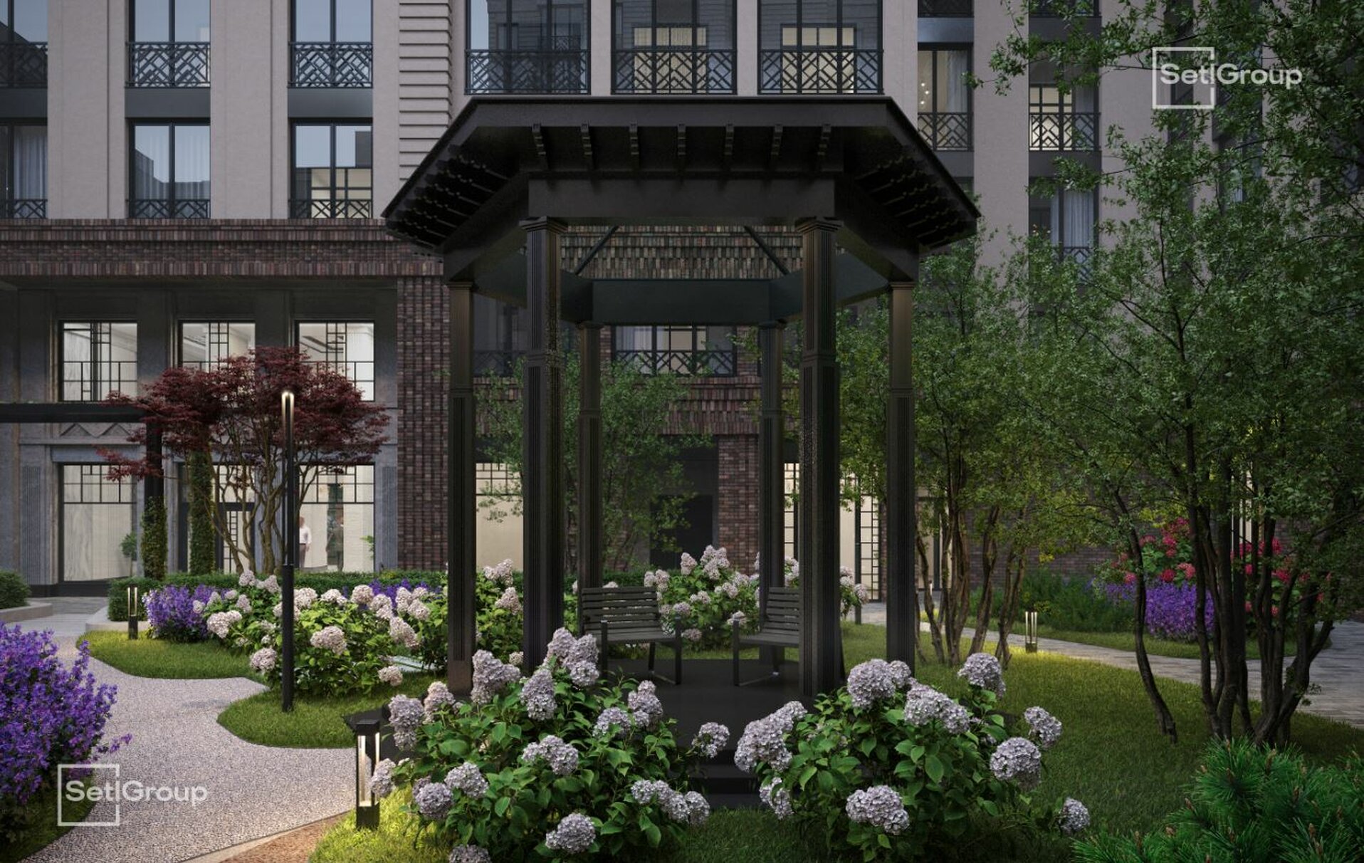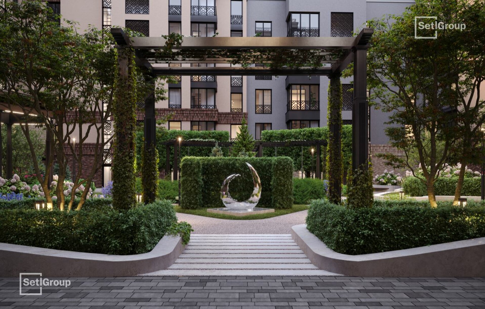 Во дворе — закрытый ландшафтный сад с фонтаном, лаунж-зонами и зелёными гостиными, доступный только резидентам. В проекте также предусмотрен подземный паркинг с местами для электромобилей.