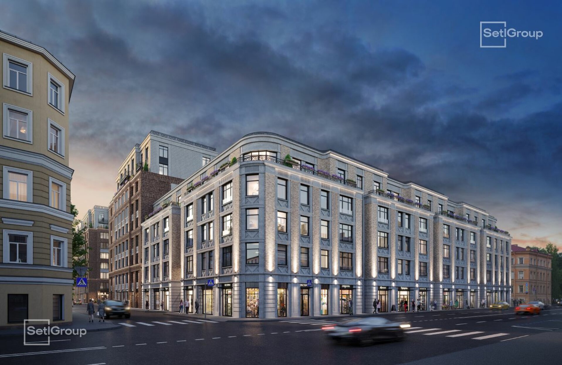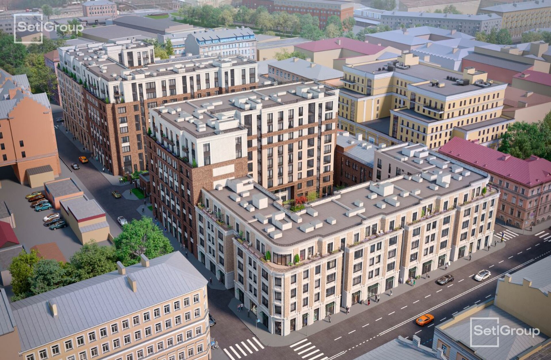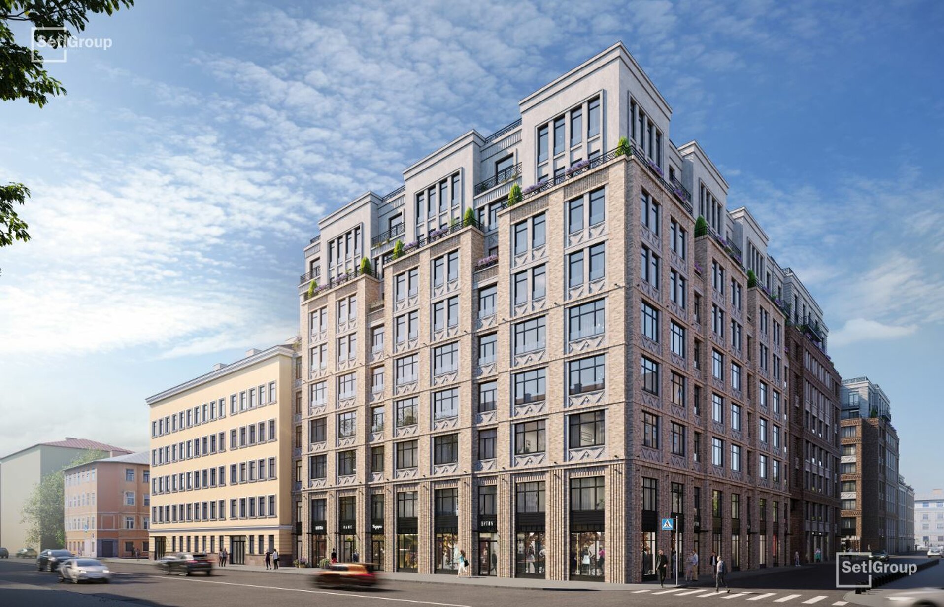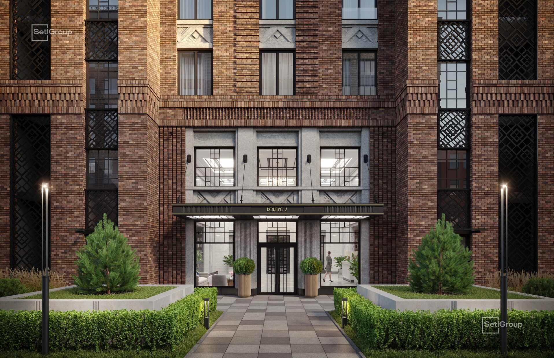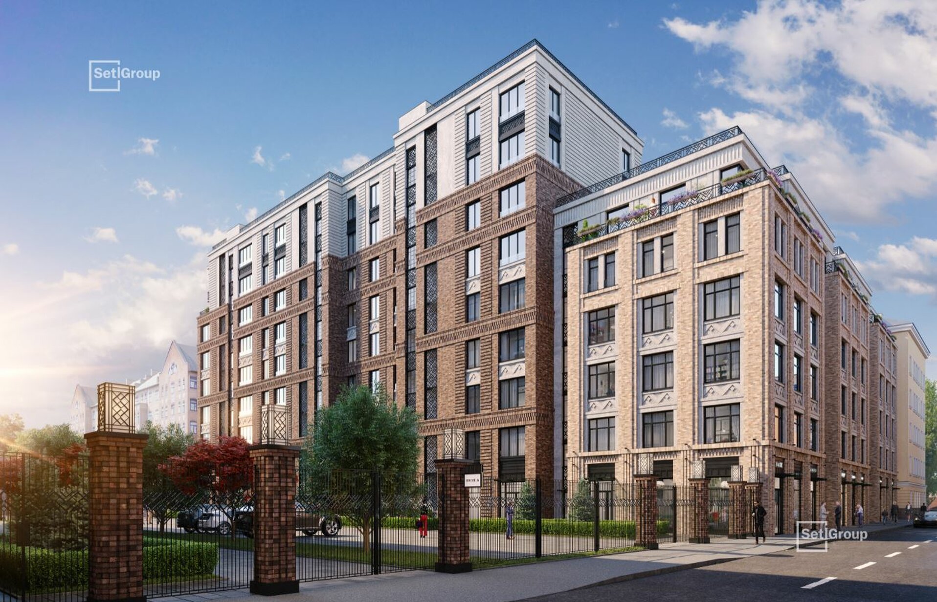 Во дворе — закрытый ландшафтный сад с фонтаном, лаунж-зонами и зелёными гостиными, доступный только резидентам. В проекте также предусмотрен подземный паркинг с местами для электромобилей.