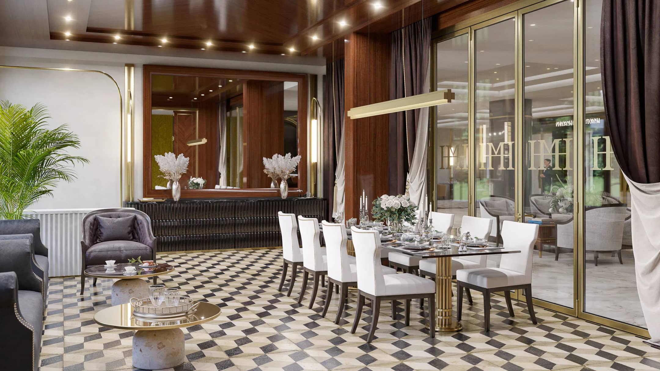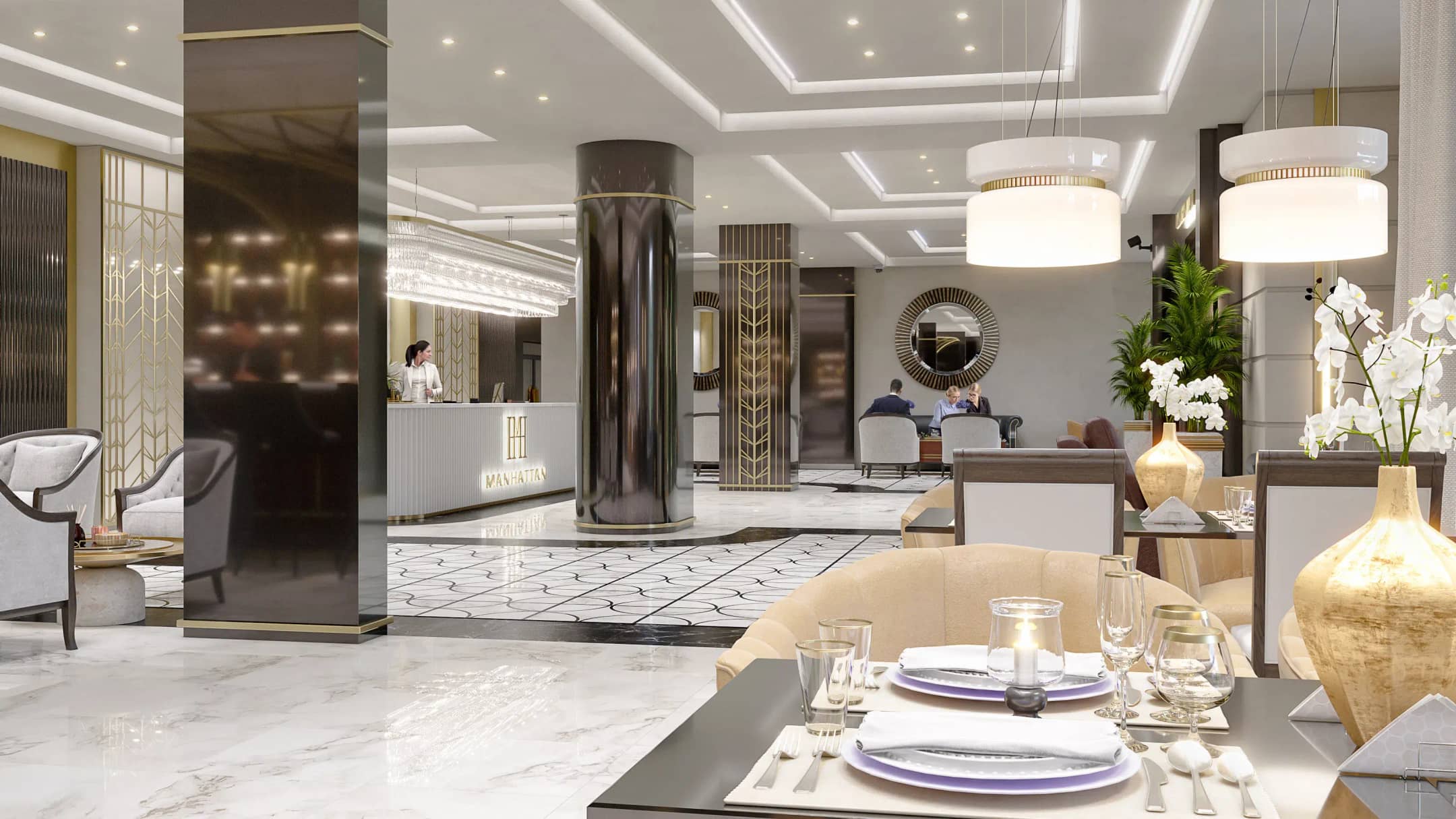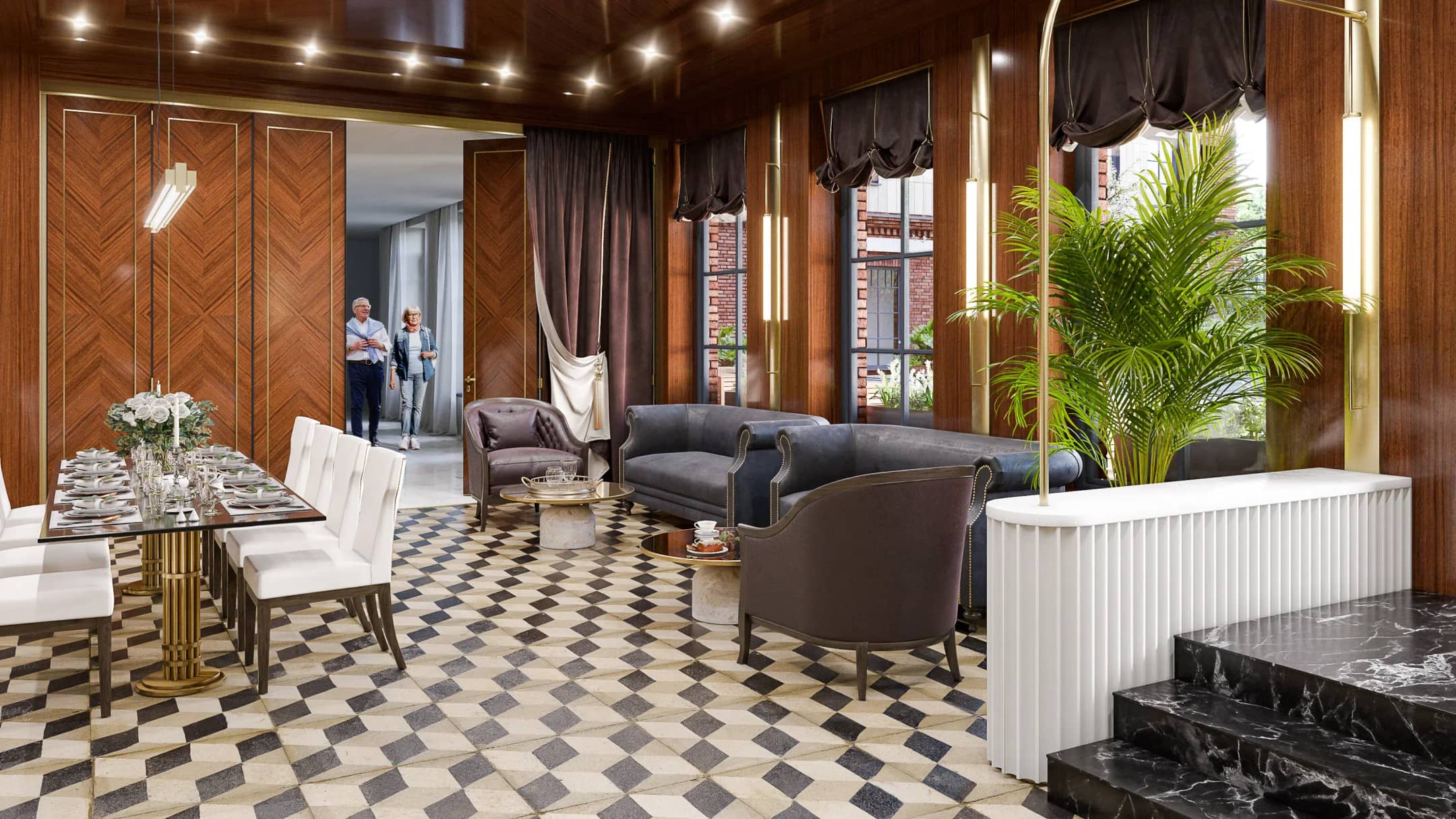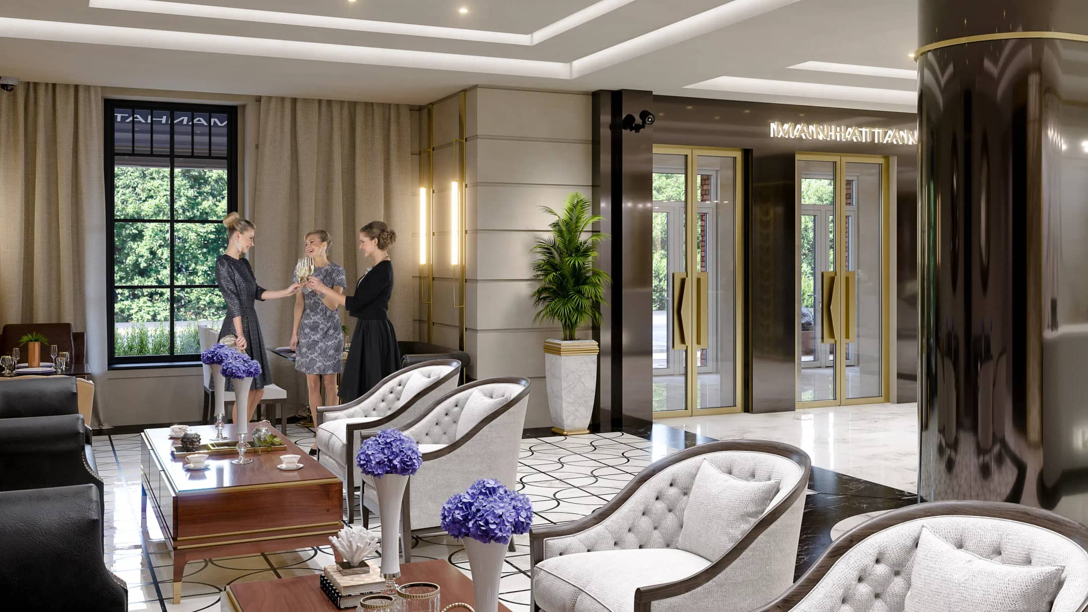 Жителей встречает величественное лобби, зона ожидания, консьерж-сервис, фитнес и SPA-комплекс, ресторан и лобби-бар, подземный паркинг и закрытый внутренний двор.