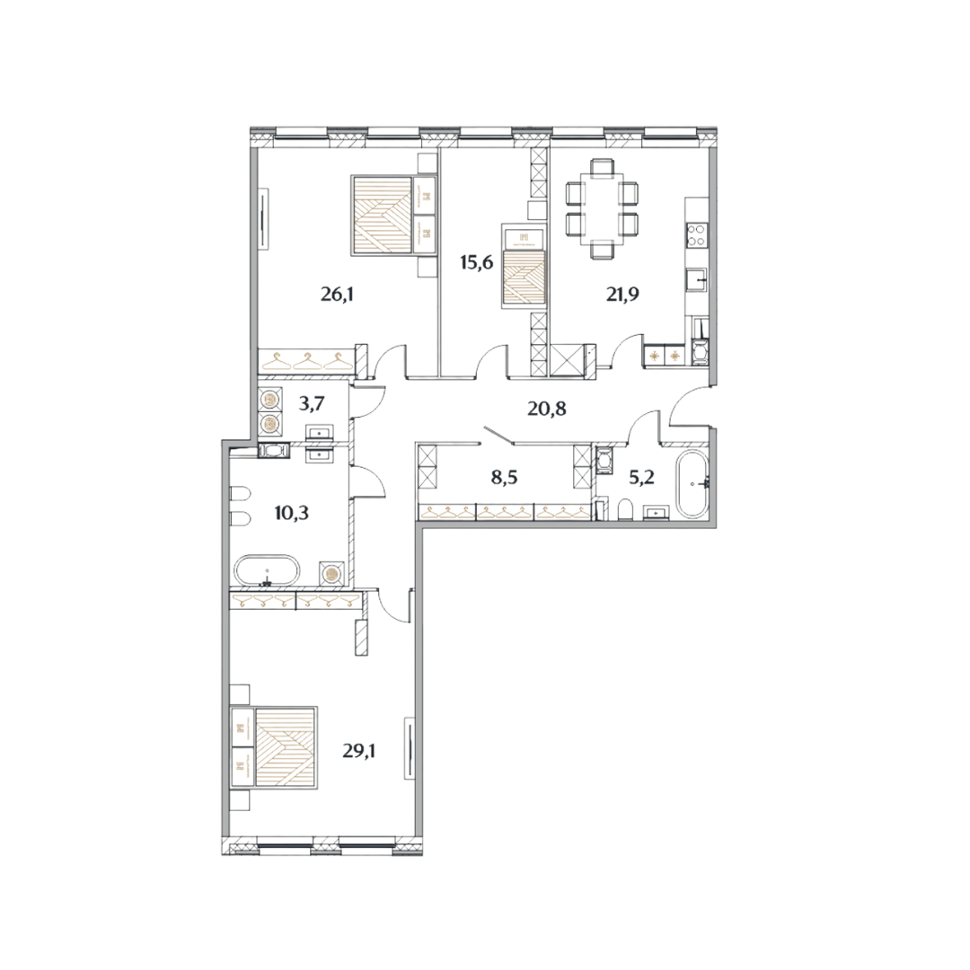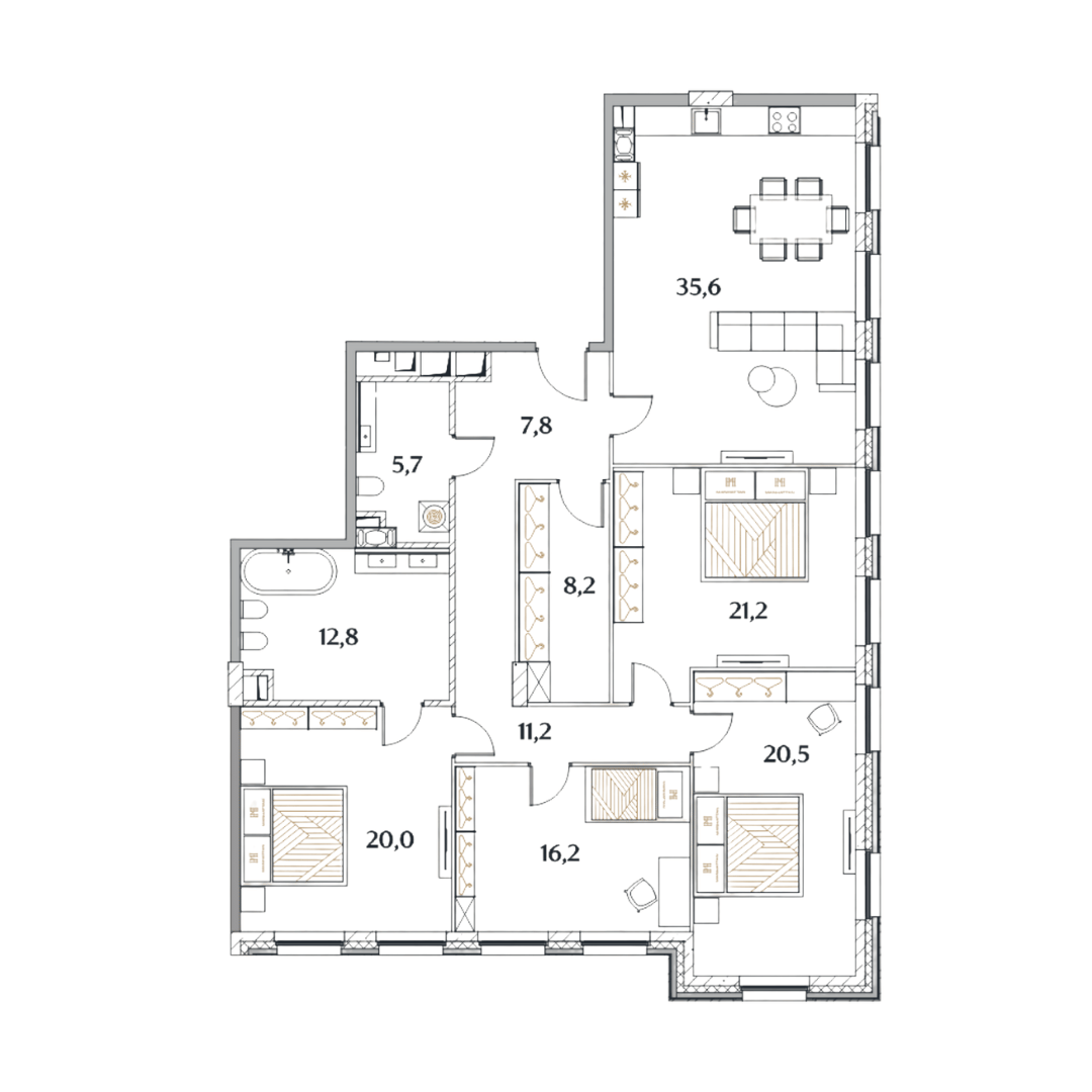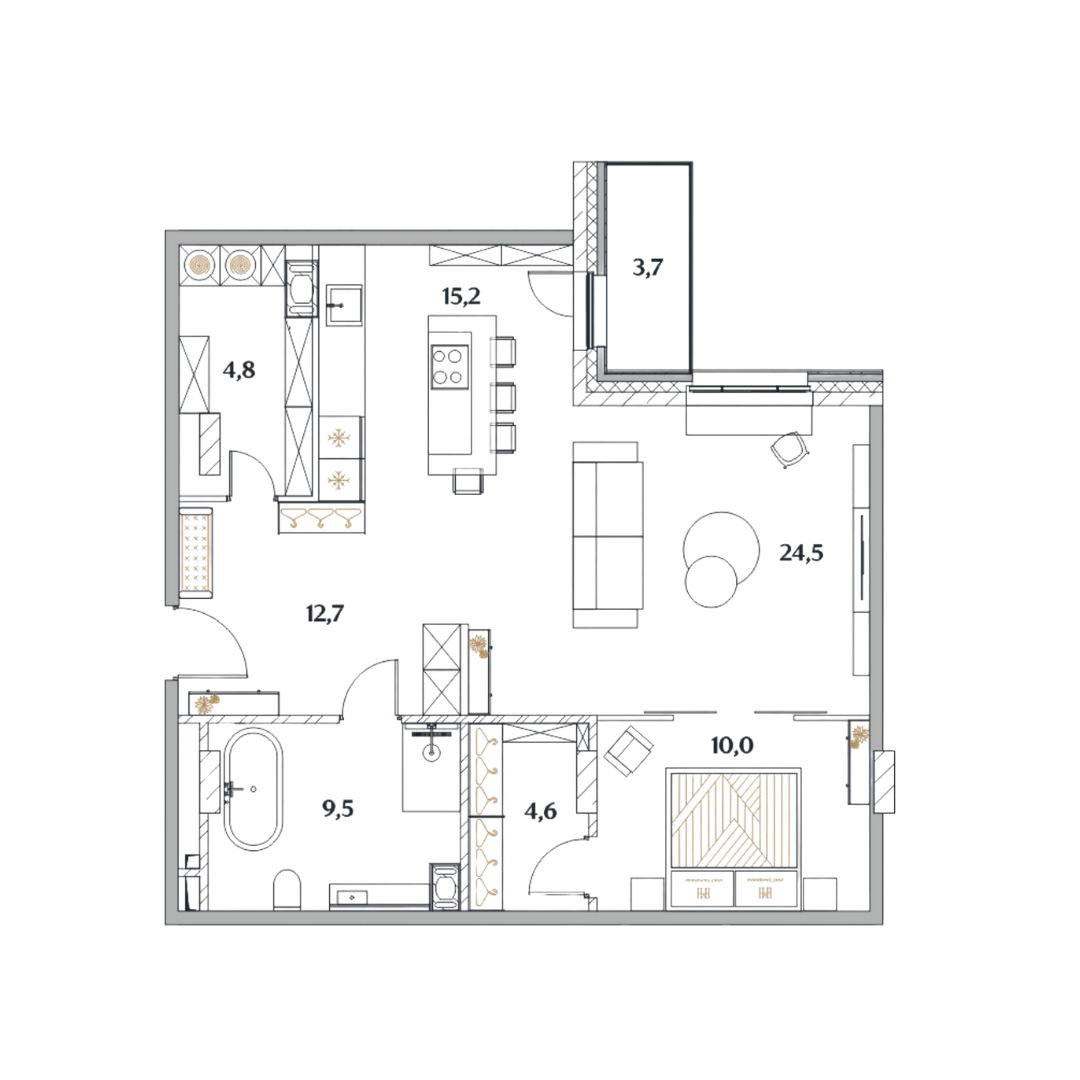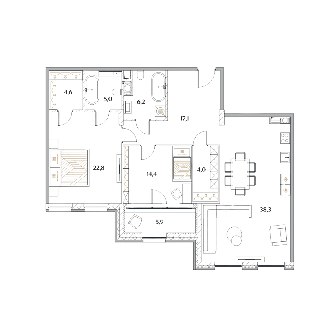В доме всего 61 квартира — от просторных евро-планировок до пентхаусов с террасами и панорамными окнами. Во всех резиденциях — высокие потолки, улучшенная шумоизоляция, системы фильтрации воздуха, тёплые полы, мультирум, умный дом.