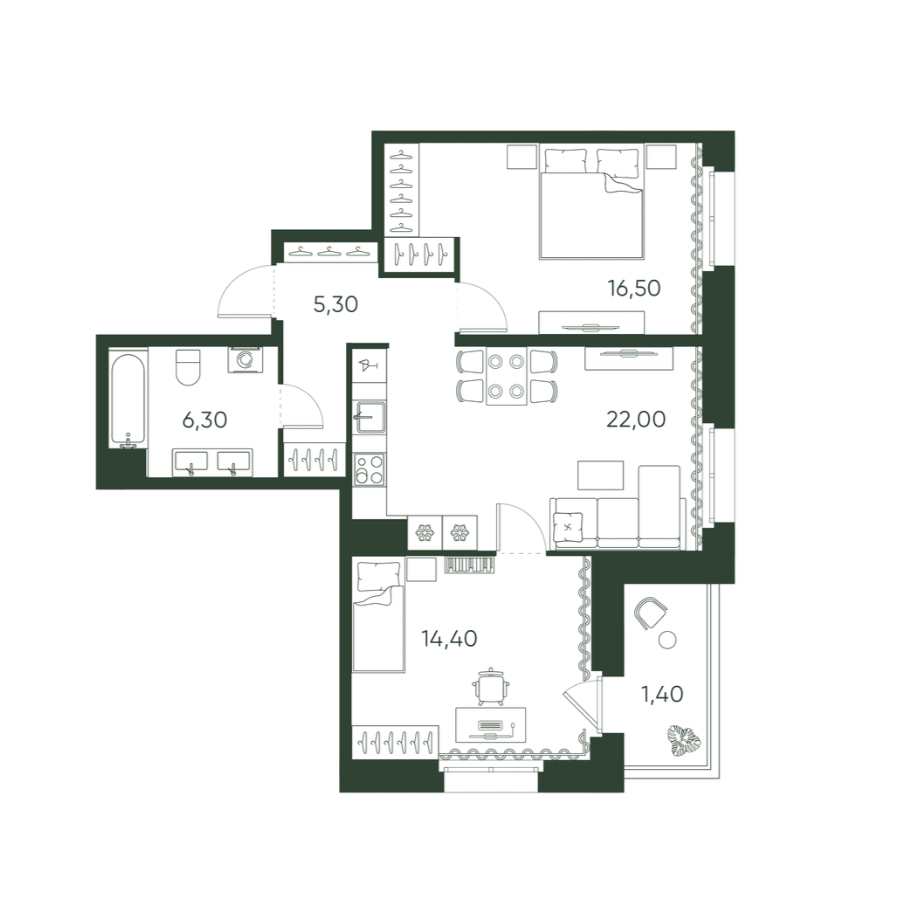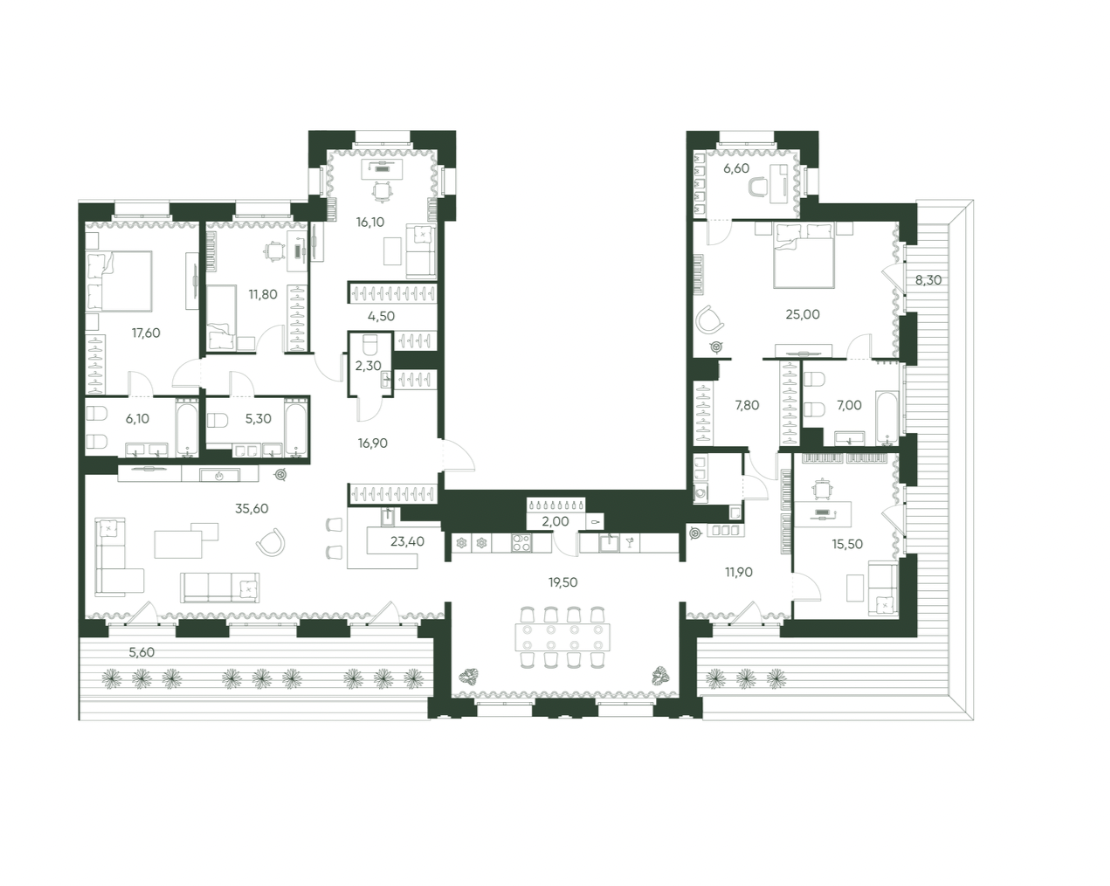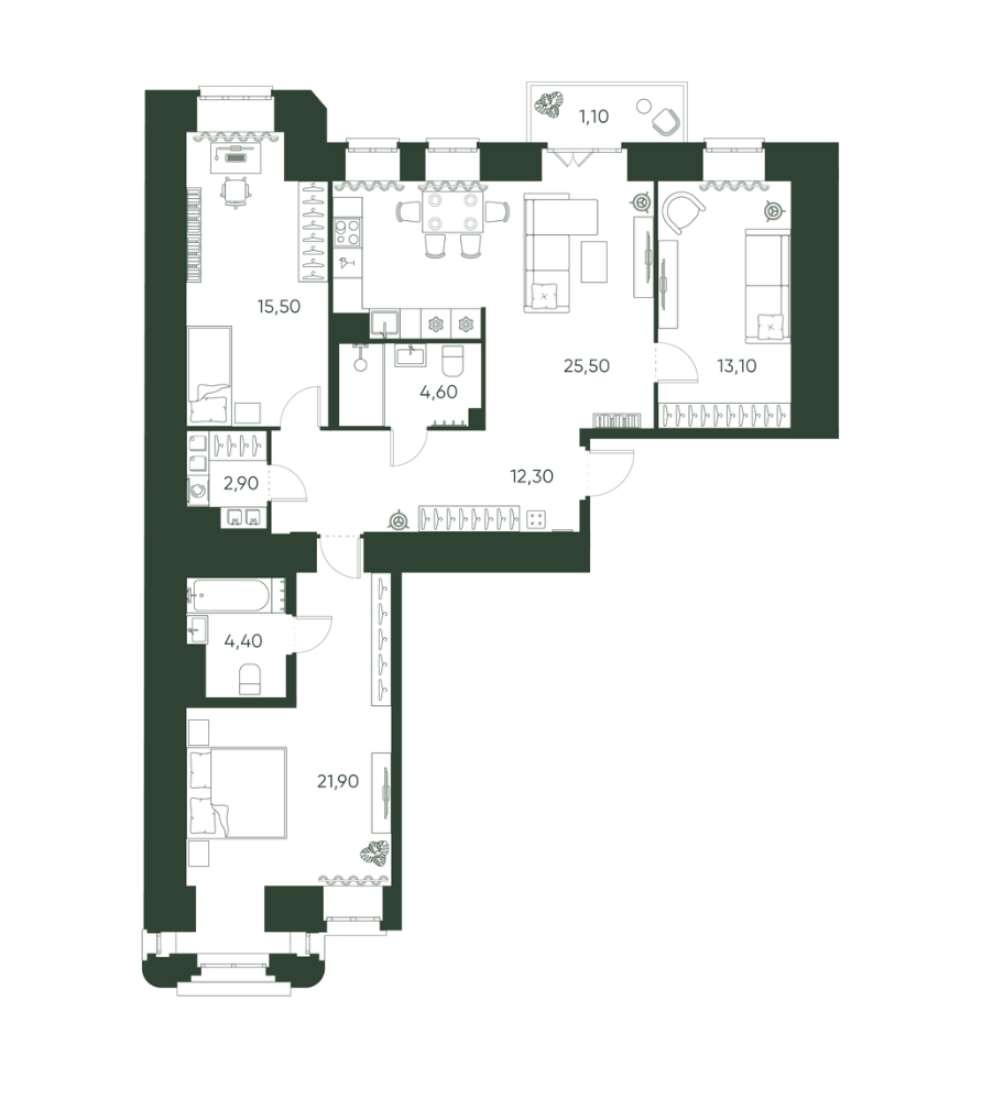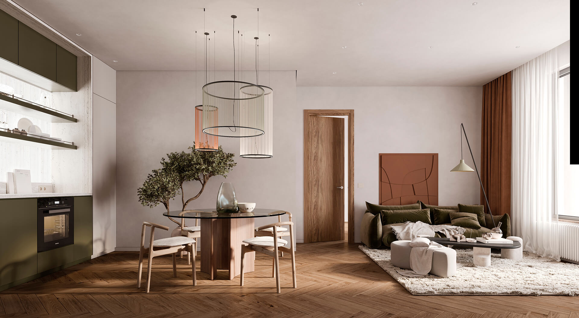 Квартал рассчитан на 167 резиденций, включая уникальные пентхаусы с террасами и каминами. Интерьеры выполнены в концепции премиального white box, с высотой потолков от 3 до 3,3 м и продуманной шумоизоляцией.