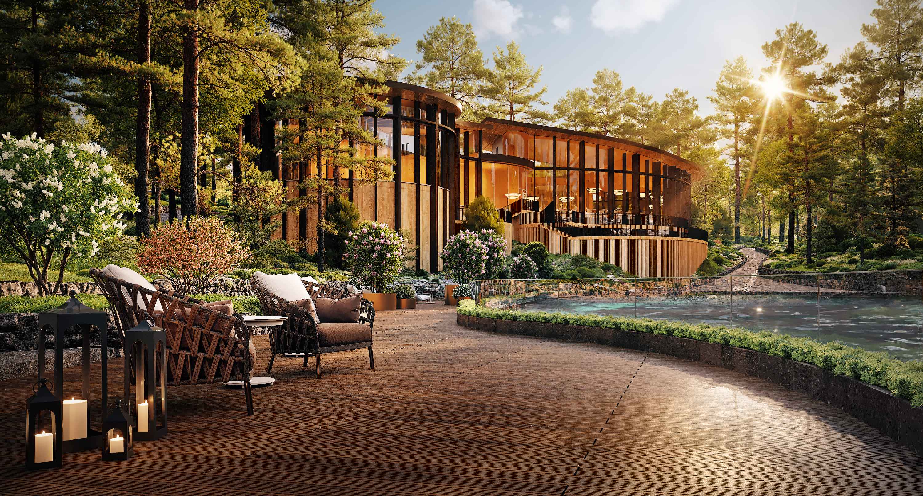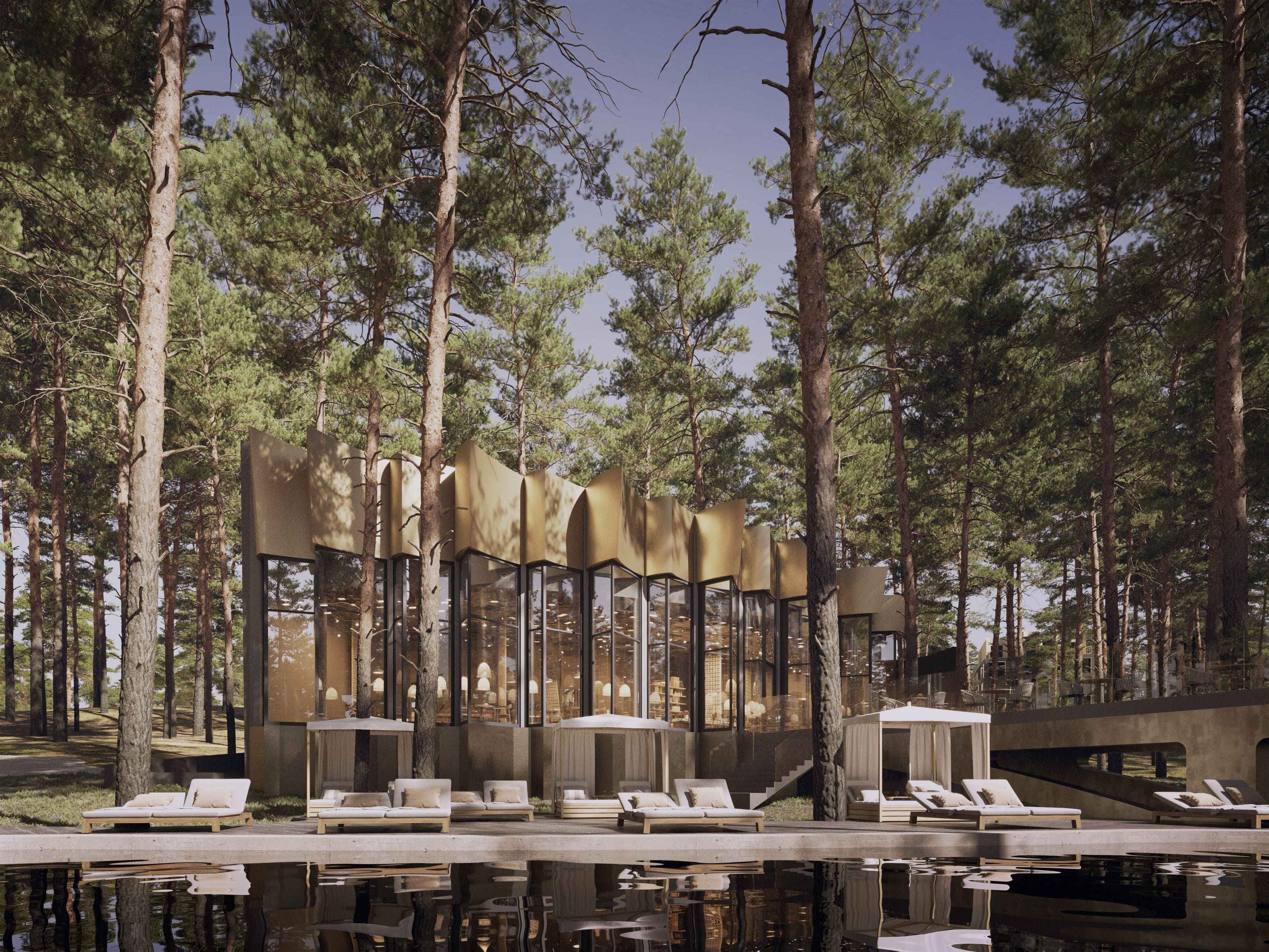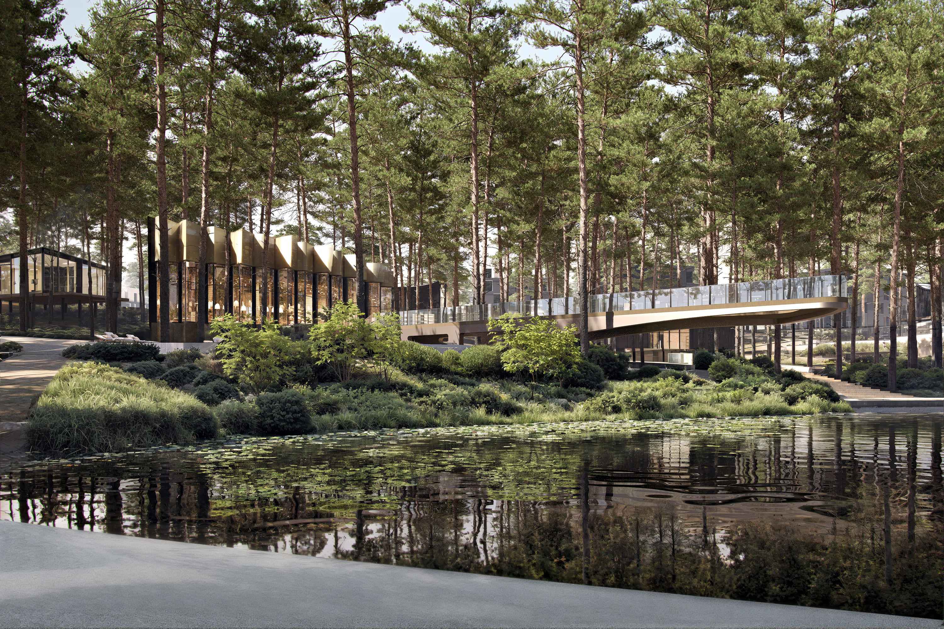 На территории — восемь корпусов резиденций и четыре сервисных корпуса, пятизвёздочный отель под управлением Cosmos Hotel Group, рестораны, SPA-комплекс с бассейном, фитнес-зона, пляж, галерея современного искусства и винный клуб. Всё окружено авторским ландшафтом от DEREVO PARK с прогулочными аллеями, амфитеатром и арт-объектами.