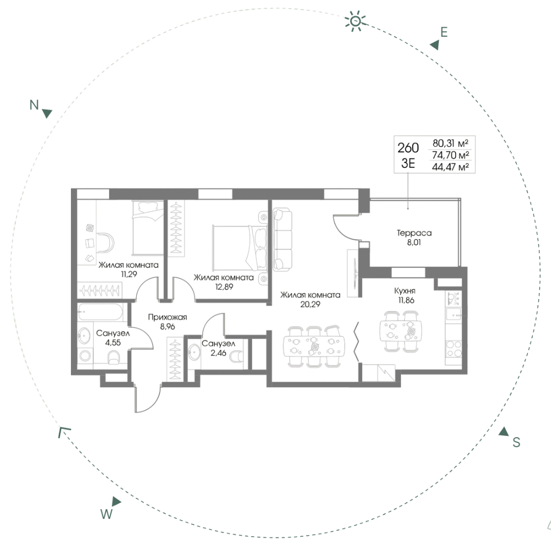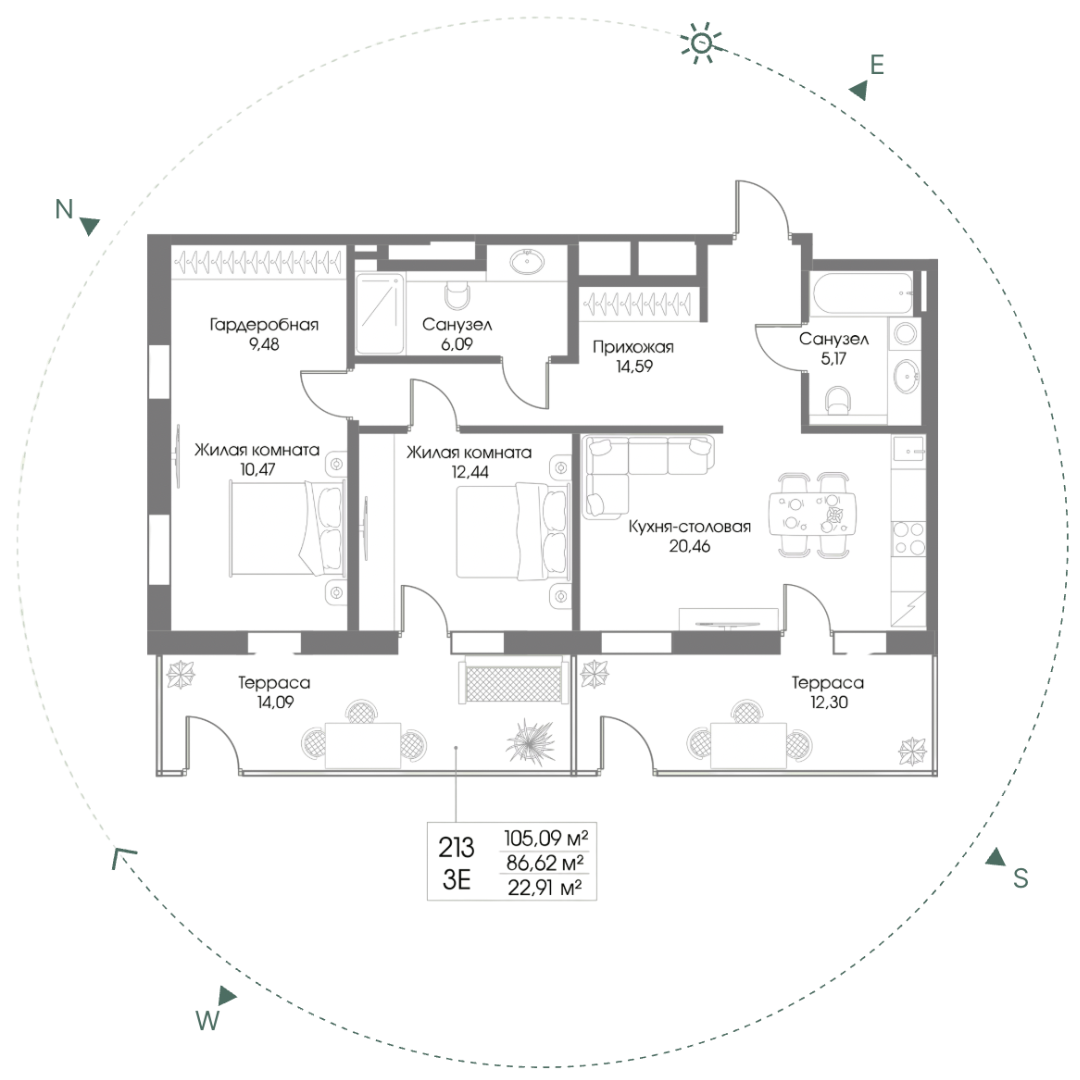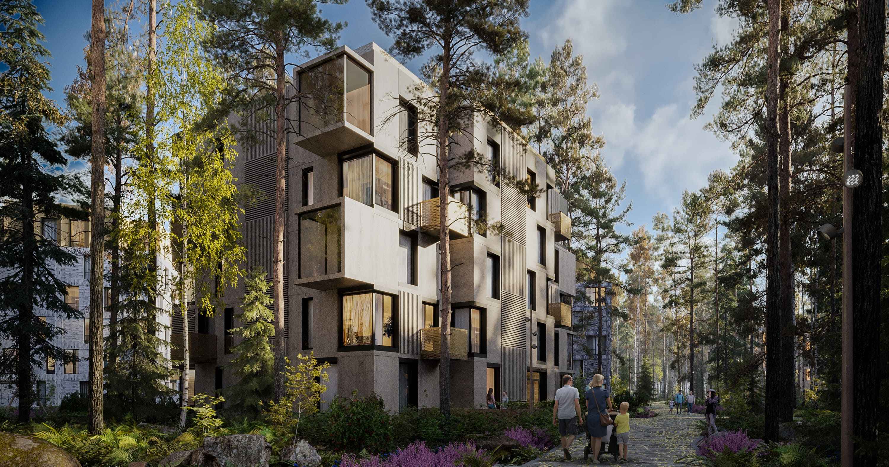 Более 40 типов резиденций площадью от 40 до 150 м² с панорамным остеклением, террасами и отделкой в двух стилях от студии Balcon. Интерьеры лобби созданы Point Design, в проектах используются натуральные материалы, индивидуальные планировки и системы «умный дом».