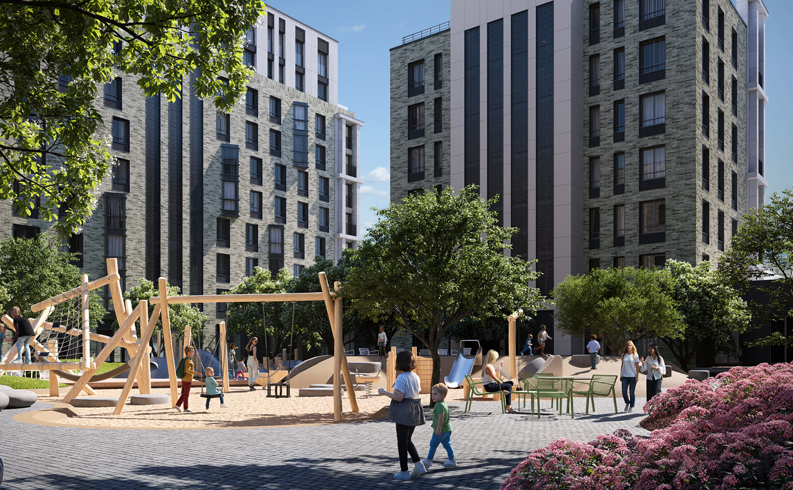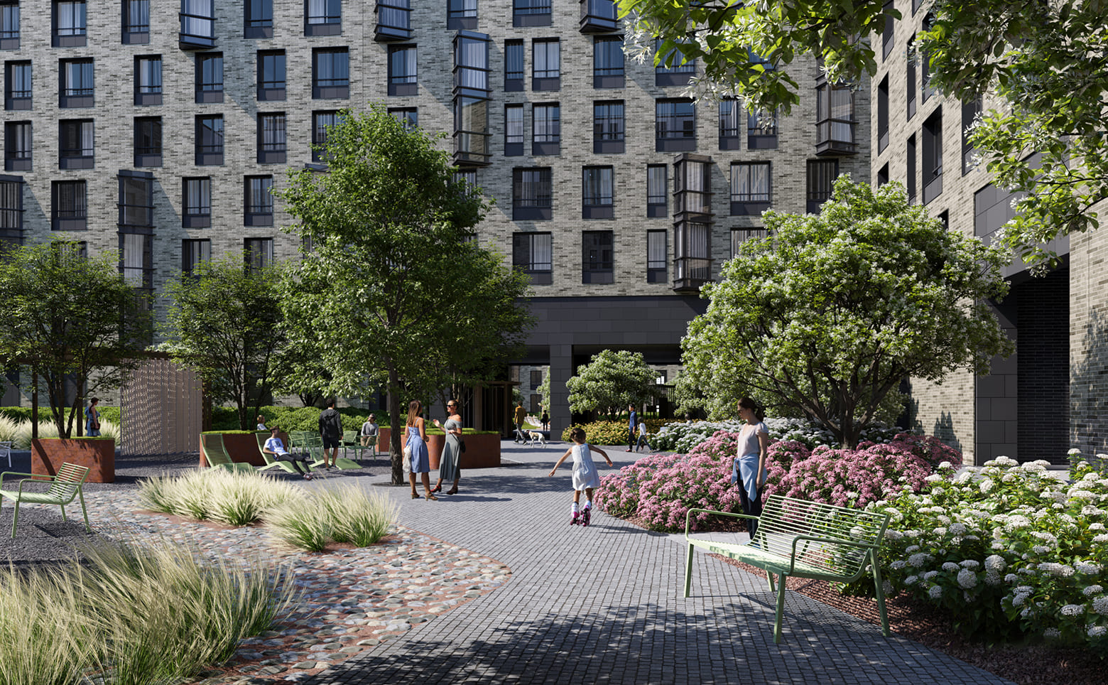 Комфорт дополняют дизайнерские лобби с зонами ожидания, бесключевой доступ Face ID, видеонаблюдение 24/7, консьерж-сервис и подземный паркинг с зарядками для электромобилей. Территория комплекса закрыта и озеленена: двор без машин, детская площадка, тихие зоны отдыха и продуманный ландшафт.