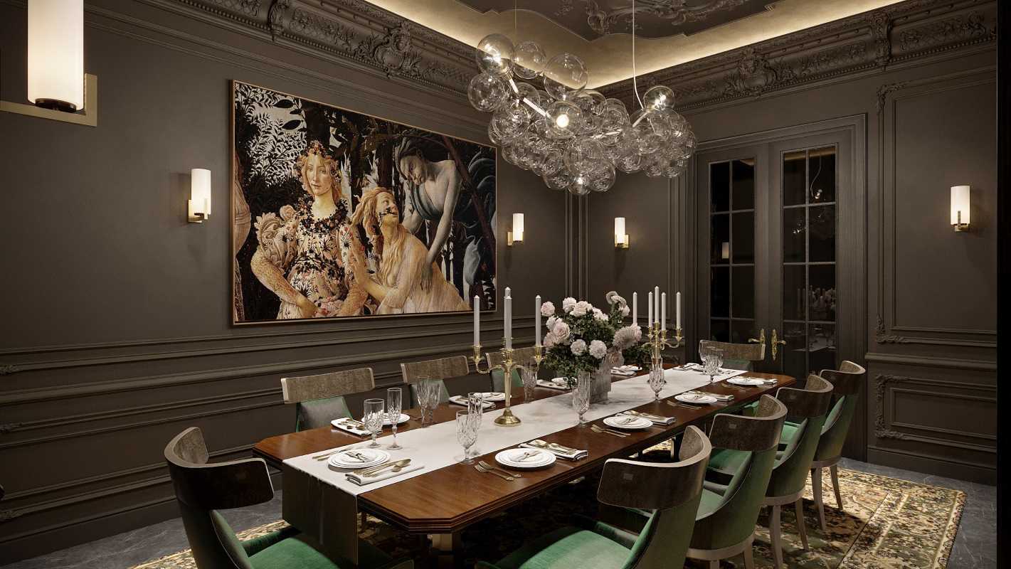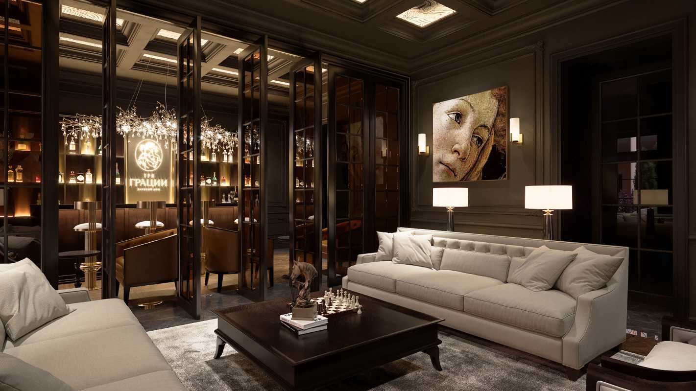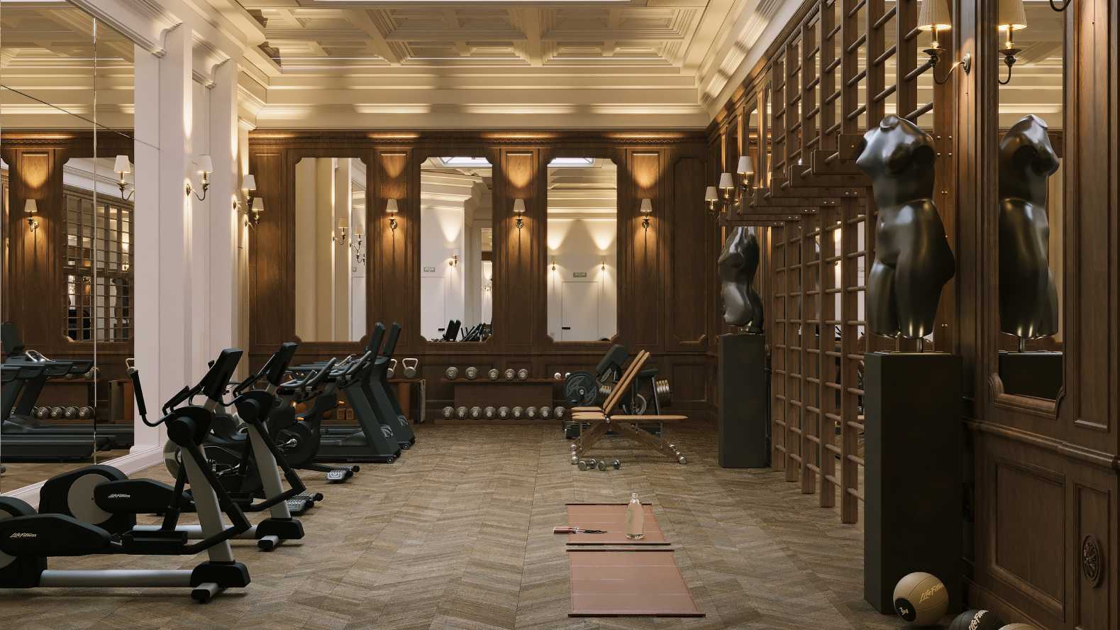 Кухня-столовая для семейных мероприятий. Сигарная комната. Фитнес-зал для резидентов. Внутренний двор.